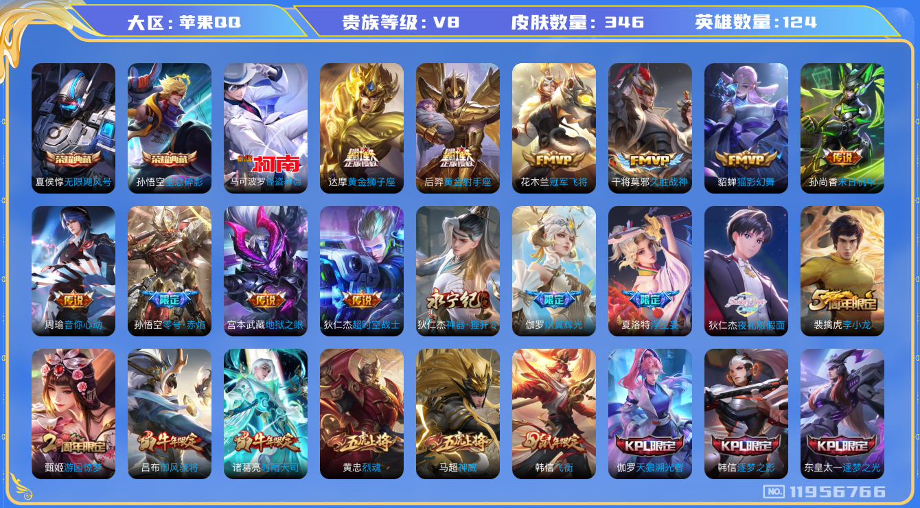 [11956766]【商品标题】:苹果Q-V8-永恒钻石III段位-124英雄-346皮肤-2典藏-0珍品无双-0无双-1珍品传说-19传说-95史诗