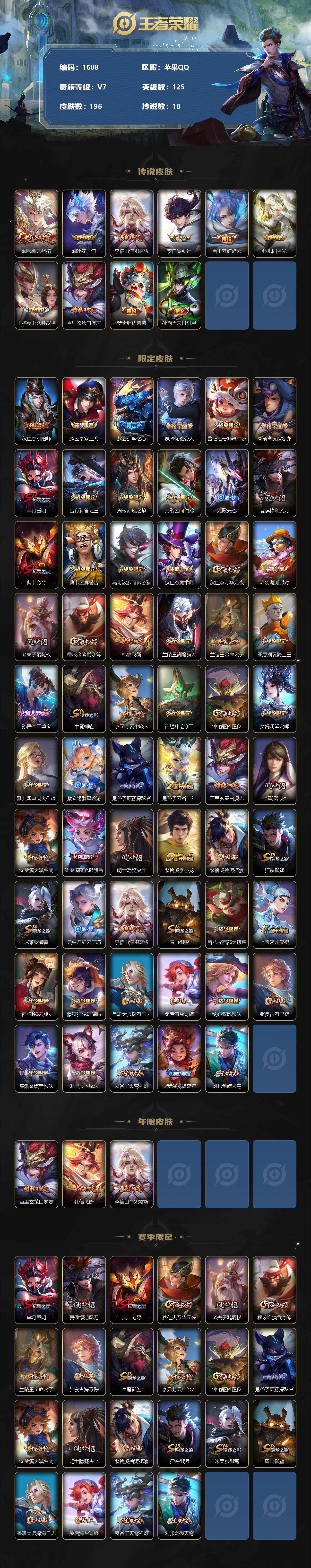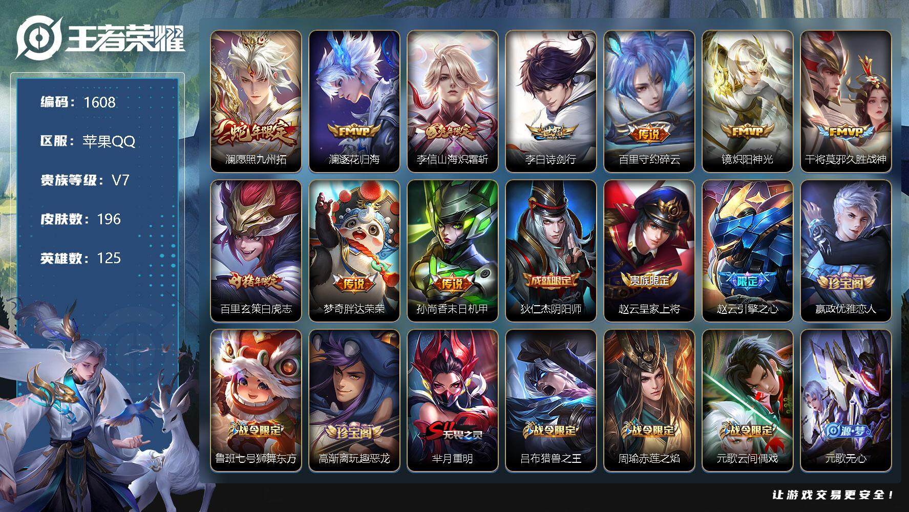 [11956954]【商品标题】:苹果Q-V0-永恒钻石III段位-125英雄-196皮肤-0典藏-0珍品无双-0无双-0珍品传说-10传说-50史诗