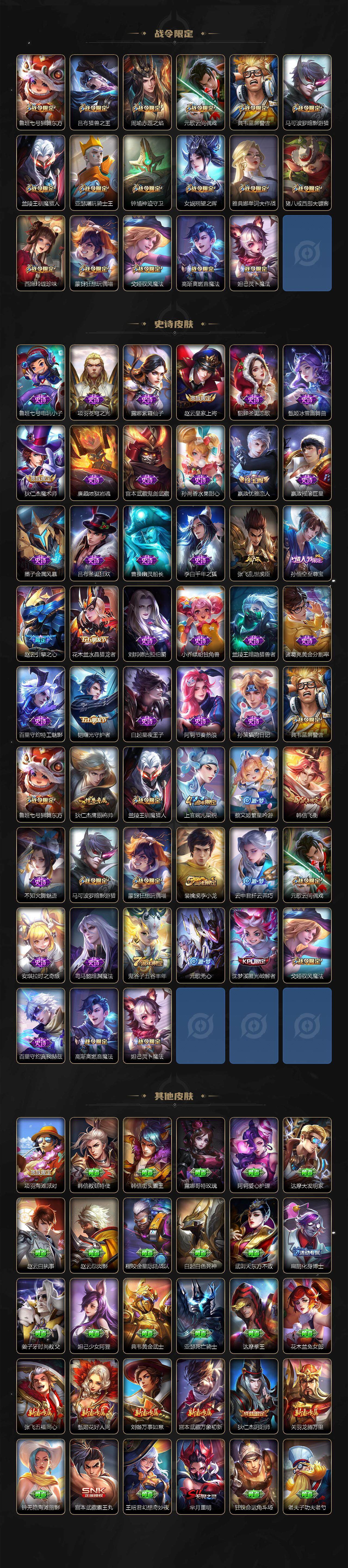 【限定皮肤】:狄仁杰阴阳师,赵云皇家上将,赵云引擎之心,嬴政优雅恋人,鲁班七号狮舞东方,高渐离玩趣恶龙,芈月重明,吕布猎兽之王,周瑜赤莲之焰,元歌云间偶戏,元歌无心,夏侯惇朔风刀,典韦穷奇,典韦蓝屏警告,马可波罗暗影游猎,狄仁杰魔术师,狄仁杰万华元夜,项羽海滩派对,老夫子醍醐杖,程咬金演武夺筹,韩信飞衡,兰陵王驯魔猎人,兰陵王金庭之子,亚瑟潮玩骑士王,孙悟空至尊宝,牛魔御旌,李元芳云中旅人,钟馗神迹守卫,钟馗驱傩正仪,女娲朔望之晖,雅典娜单词大作战,蔡文姬繁星吟游,鬼谷子原初探秘者,鬼谷子五谷丰年,百里玄策白虎志,弈星混沌棋,沈梦溪大漠名商,沈梦溪匿光破解者,明世隐疑决卦,裴擒虎李小龙,裴擒虎擒涛扼浪,狂铁御狮,米莱狄御霄,云中君纤云弄巧,李信山海炽霜斩,盾山御銮,猪八戒西部大镖客,上官婉儿梁祝,西施玲珑珍味,蒙犽狂想玩偶喵,鲁班大师探海日志,桑启海盐诗旅,戈娅驭风魔法,张良古海寻踪,高渐离燃音魔法,妲己灵卜魔法,鬼谷子天穹祈灯,沈梦溪龙舞盛年,刘邦剑破天穹