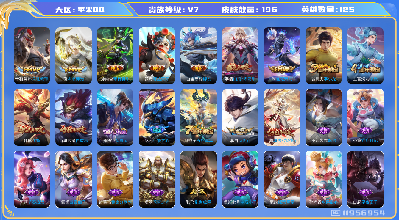 - [12296836]V9 2典藏 1无双 1珍品传说 29传说 124英雄 297皮肤 可修改实名 优质装备:全息碎影(猴子典藏),九霄神辉(木兰典藏),青丘·九尾(妲己无双),器灵·落星盏,黄金射手座,云鹰飞将(小将军),绛天战甲(鸡嘴战神),猫影幻舞,炽阳神光,一念神魔,末日机甲-孙尚香(绿蚂蚱),仲夏夜之梦(大飞蛾),零号·赤焰,地狱之眼,胖达荣荣,乞巧织情,淬星耀世,末日机甲-孙策,无双飞将,山海·炽霜斩(李信年限),山海·苍雷引(电光曜子),浮生妄,青丘·九尾,妄想奇谈 传说皮:续相思,星之鸣奏,幻光神枪 珍宝阁皮:玩趣恶龙 限定皮:愿照·岁时盈(虞姬年限),愿照·众生和(妲己年限),愿照·千秋盛(女娲年限),鸣野蒿,至尊宝,傲雪梅枪,神威(电光马子),飞衡(韩信年限),齐天大圣,降魔,五谷丰年,青龙志(铠年限),梁祝,御风骁将(吕布年限),龙胆,朱雀志(守约年限),孙行者,大圣娶亲,引擎之心,乒乒小将,美猴王,深海之息(深海大菠萝),山海·玄木吟(马可年限) 史诗皮:器灵·浮梦炉,龙之律动,紫霞仙子,苍穹之光,电玩小子(小书包),黄金分割率,特工魅影,千年之狐,永昼,江河有灵,百解令(蒙犽),蒙恬荣光圣徽,无限星赏官,冰冠公主,青蛇,偶像歌手,白蛇,晚萤,末日机甲-吕布,猫狗日记-孙策,猫狗日记-大乔,时之恋人-孙尚香,乱世虎臣,节奏热浪,修罗,女仆咖啡,摇滚巨星,水果甜心,绅士熊喵,天才门将,星夜王子,心灵骇客,功夫厨神,德古拉伯爵,暗隐猎兽者,幽灵船长,鬼剑武藏,心灵战警,舞动绿茵,地狱岩魂,缤纷独角兽,乘风破浪,逐浪之夏,月团寄思,水晶猎龙者,曙光守护者,箭羽风息,金属风暴,原初追逐者,圣诞狂欢,圣诞恋歌,鹰眼统帅,暗夜贵公子,魅力维加斯,赏金猎手,天秀·音浪,千筹问战,无心,未来纪元-赵云
