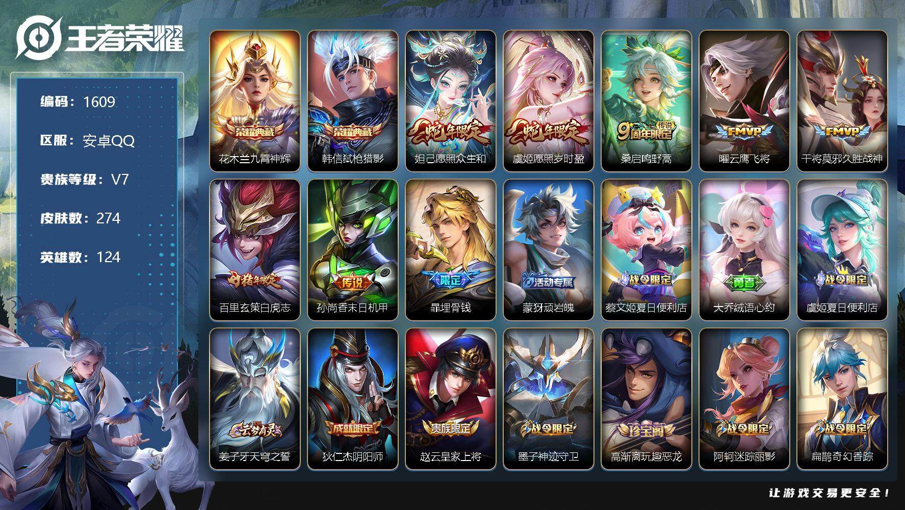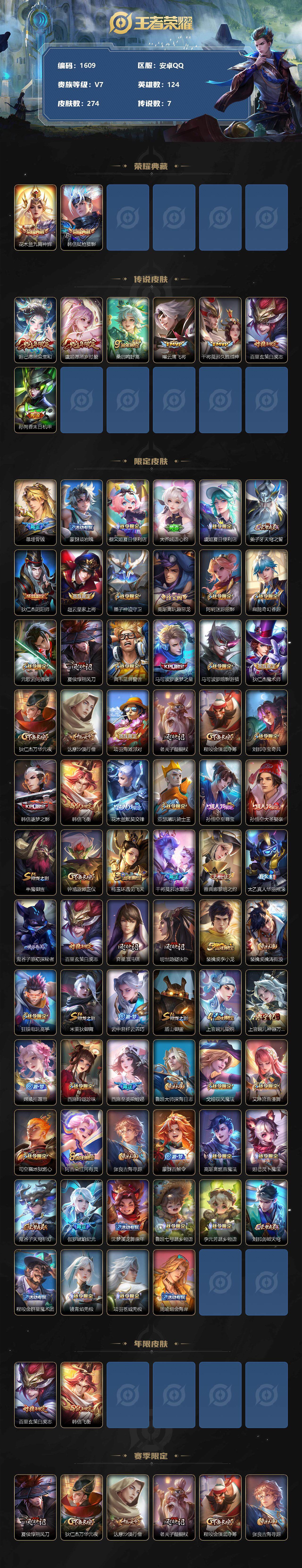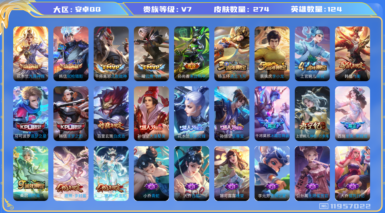 [11957022]【商品标题】:安卓Q-V7-最强王者段位-124英雄-274皮肤-2典藏-0珍品无双-0无双-0珍品传说-7传说-89史诗
