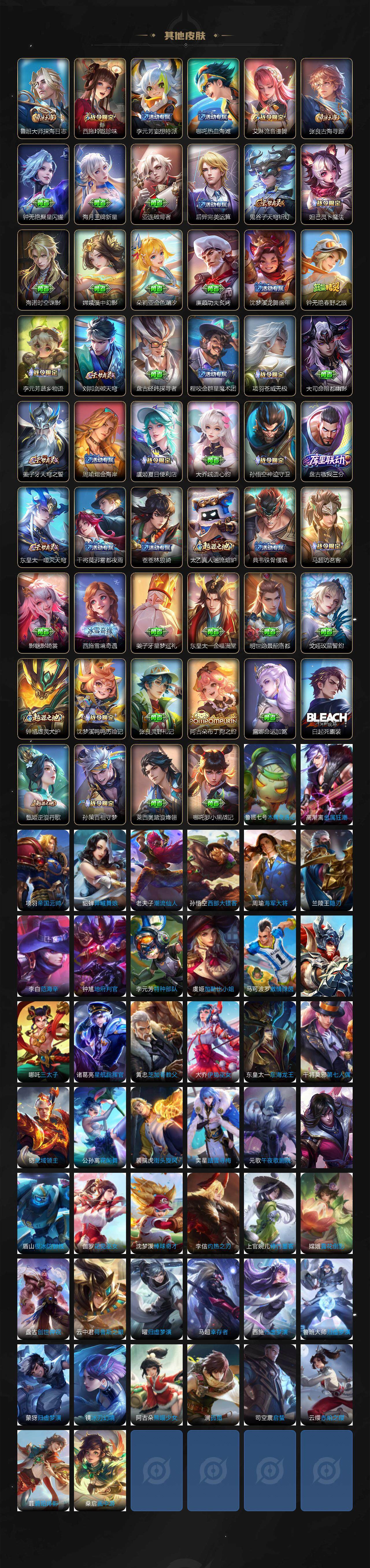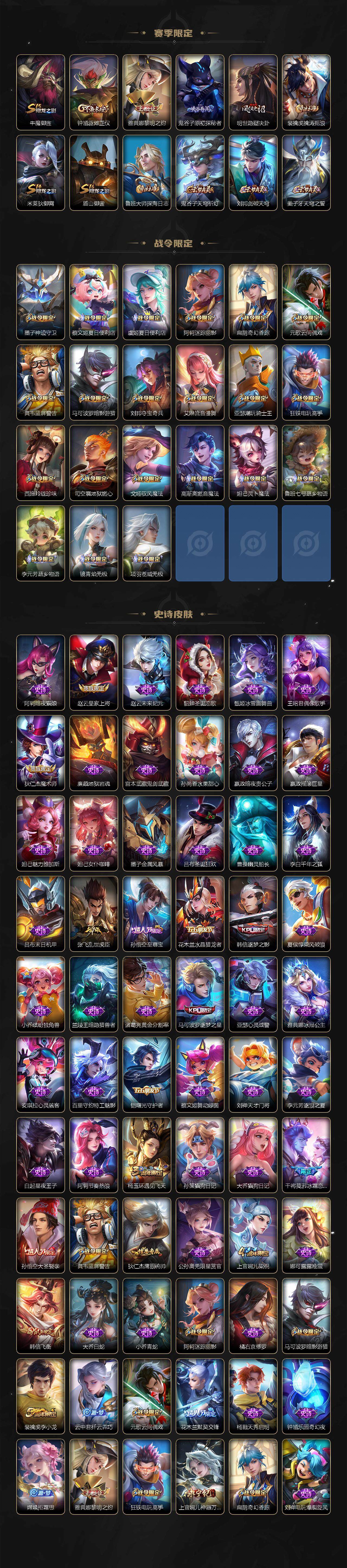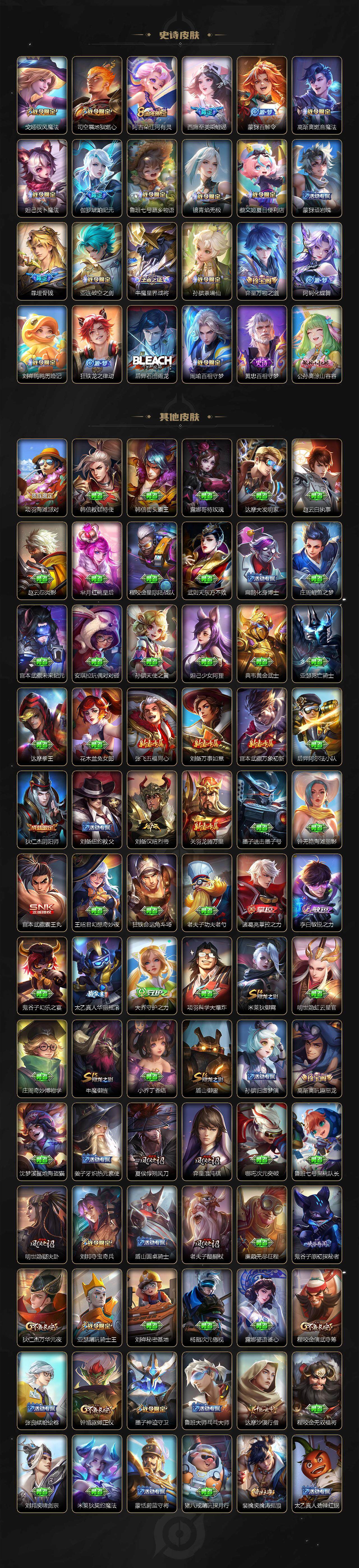 【限定皮肤】:暃埋骨钱,蒙犽顽岩魄,蔡文姬夏日便利店,大乔绒语心约,虞姬夏日便利店,姜子牙天穹之誓,狄仁杰阴阳师,赵云皇家上将,墨子神迹守卫,高渐离玩趣恶龙,阿轲迷踪丽影,扁鹊奇幻香踪,元歌云间偶戏,夏侯惇朔风刀,典韦蓝屏警告,马可波罗逐梦之星,马可波罗暗影游猎,狄仁杰魔术师,狄仁杰万华元夜,达摩沙漠行僧,项羽海滩派对,老夫子醍醐杖,程咬金演武夺筹,刘邦夺宝奇兵,韩信逐梦之影,韩信飞衡,花木兰默契交锋,亚瑟潮玩骑士王,孙悟空至尊宝,孙悟空大圣娶亲,牛魔御旌,钟馗驱傩正仪,杨玉环遇见飞天,干将莫邪冰霜恋舞曲,雅典娜黎明之约,太乙真人华丽摇滚,鬼谷子原初探秘者,百里玄策白虎志,弈星混沌棋,明世隐疑决卦,裴擒虎李小龙,裴擒虎擒涛扼浪,狂铁电玩高手,米莱狄御霄,云中君纤云弄巧,盾山御銮,上官婉儿梁祝,上官婉儿神器万象笔,嫦娥拒霜思,西施玲珑珍味,西施至美乘鲤谣,鲁班大师探海日志,戈娅驭风魔法,艾琳流音漫舞,司空震地狱燃心,阿古朵江河有灵,张良古海寻踪,蒙犽百解令,高渐离燃音魔法,妲己灵卜魔法,鬼谷子天穹祈灯,伽罗琥珀纪元,沈梦溪龙舞盛年,鲁班七号蔬乡物语,李元芳蔬乡物语,刘邦剑破天穹,程咬金群星魔术团,镜青焰无极,项羽苍威无极,周瑜熔金海岸