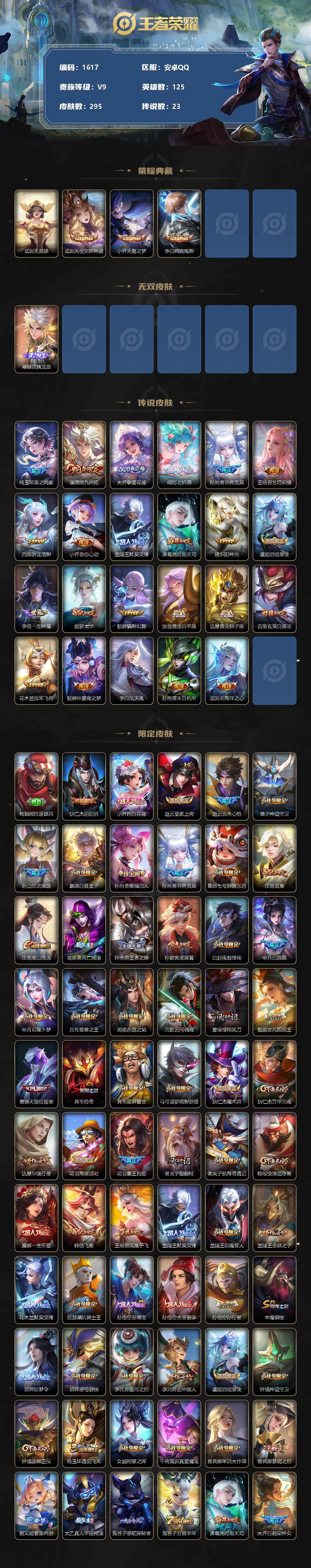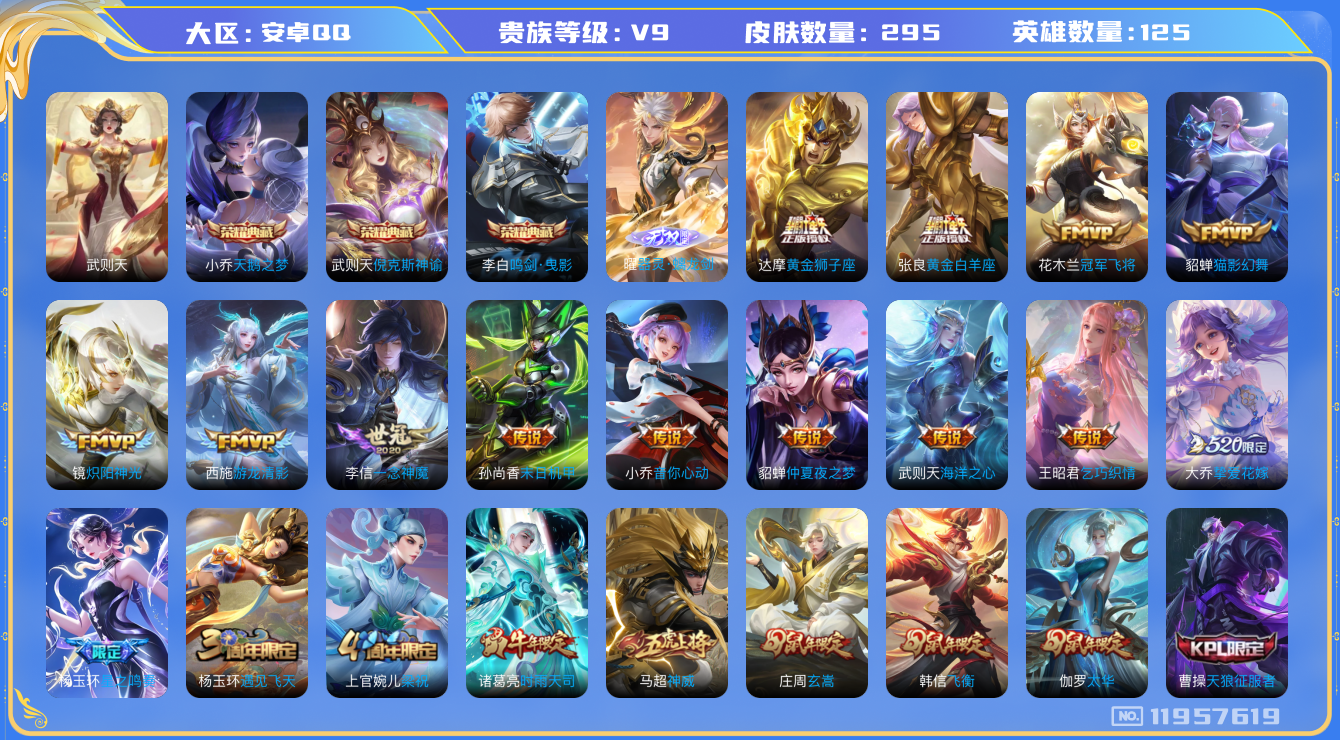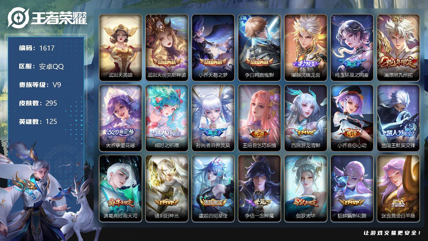 [11957619]【商品标题】:安卓Q-V9-最强王者段位-125英雄-295皮肤-3典藏-0珍品无双-1无双-0珍品传说-23传说-101史诗