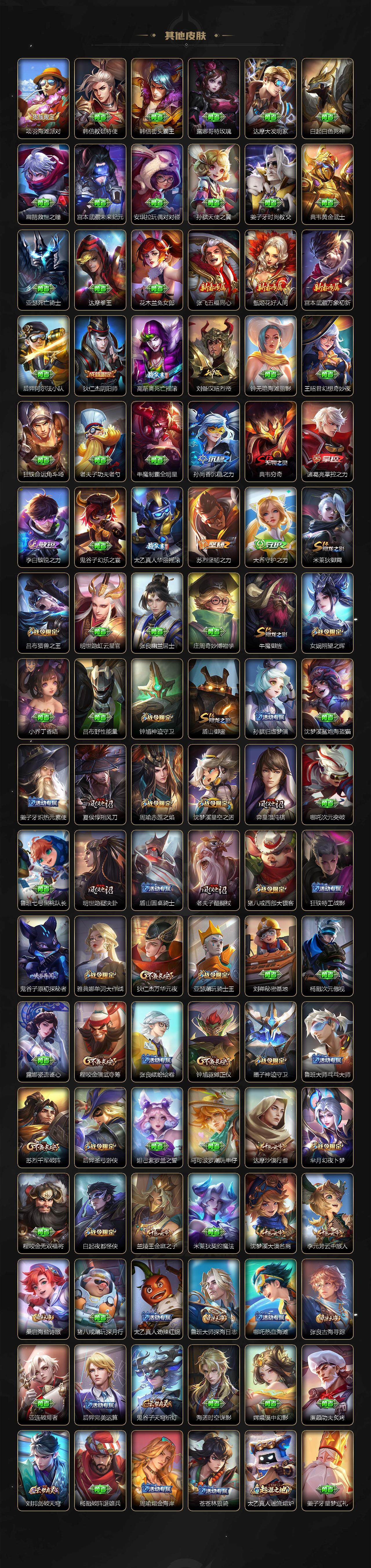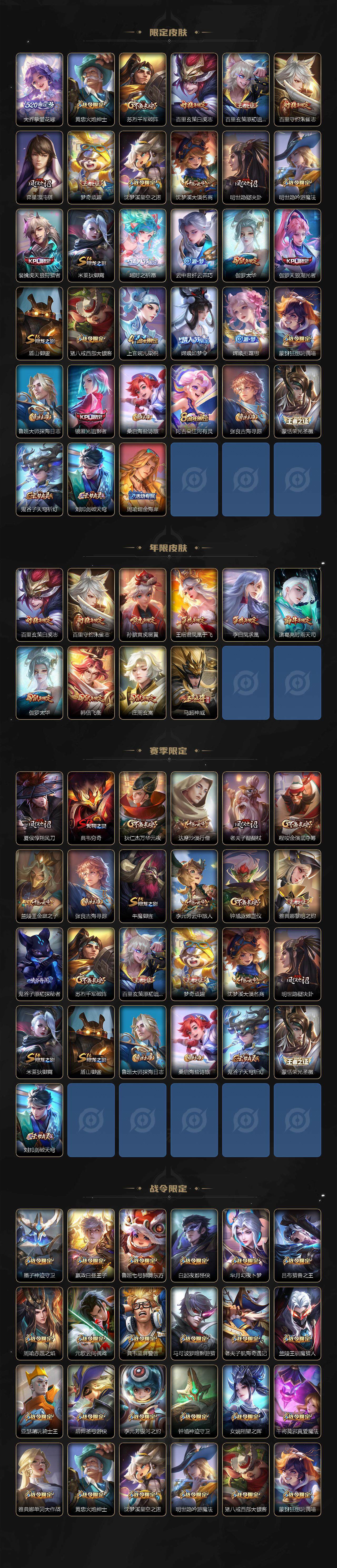【限定皮肤】:杨戬破阵退雄兵,狄仁杰阴阳师,小乔纯白花嫁,赵云皇家上将,赵云百木心枪,墨子神迹守卫,妲己时之彼端,嬴政白昼王子,孙尚香蔷薇恋人,孙尚香异界灵契,鲁班七号狮舞东方,庄周玄嵩,庄周高山流水,高渐离死亡摇滚,钟无艳王者之锤,孙膑寅虎展翼,白起夜都怪侠,芈月白晶晶,芈月幻夜卜梦,吕布猎兽之王,周瑜赤莲之焰,元歌云间偶戏,夏侯惇朔风刀,甄姬女儿国国王,曹操天狼征服者,典韦穷奇,典韦蓝屏警告,马可波罗暗影游猎,狄仁杰魔术师,狄仁杰万华元夜,达摩沙漠行僧,项羽海滩派对,项羽霸王别姬,老夫子醍醐杖,老夫子航海奇遇记,程咬金演武夺筹,露娜一生所爱,韩信飞衡,王昭君凤凰于飞,兰陵王默契交锋,兰陵王驯魔猎人,兰陵王金庭之子,花木兰默契交锋,亚瑟潮玩骑士王,孙悟空至尊宝,孙悟空大圣娶亲,孙悟空孙行者,牛魔御旌,后羿如梦令,后羿圣弓游侠,李元芳银河之约,李元芳云中旅人,虞姬启明星使,钟馗神迹守卫,钟馗驱傩正仪,杨玉环遇见飞天,女娲朔望之晖,干将莫邪真爱魔法,雅典娜单词大作战,雅典娜黎明之约,蔡文姬繁星吟游,太乙真人华丽摇滚,鬼谷子原初探秘者,鬼谷子五谷丰年,诸葛亮时雨天司,大乔白鹤梁神女,大乔挚爱花嫁,黄忠火炮绅士,苏烈千军破阵,百里玄策白虎志,百里玄策原初追逐者,百里守约朱雀志,弈星混沌棋,梦奇顽趣,沈梦溪星空之诺,沈梦溪大漠名商,明世隐疑决卦,明世隐吟游魔法,裴擒虎天狼狩猎者,米莱狄御霄,瑶时之祈愿,云中君纤云弄巧,伽罗太华,伽罗天狼溯光者,盾山御銮,猪八戒西部大镖客,上官婉儿梁祝,嫦娥如梦令,嫦娥拒霜思,蒙犽狂想玩偶喵,鲁班大师探海日志,镜匿光追影者,桑启海盐诗旅,阿古朵江河有灵,张良古海寻踪,蒙恬荣