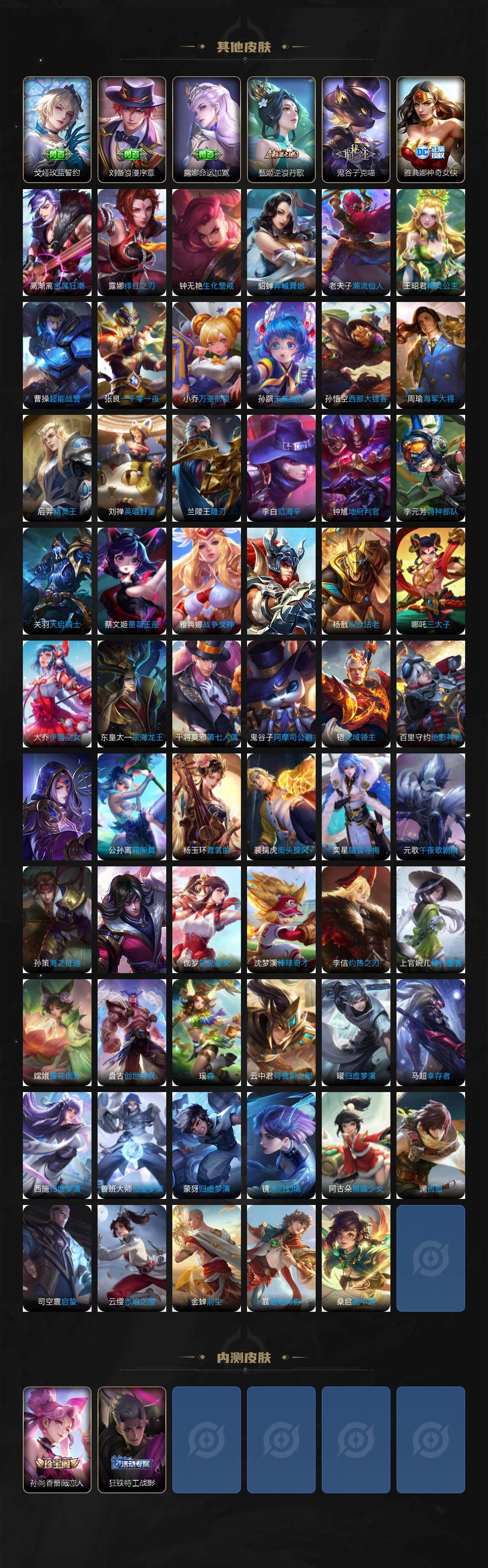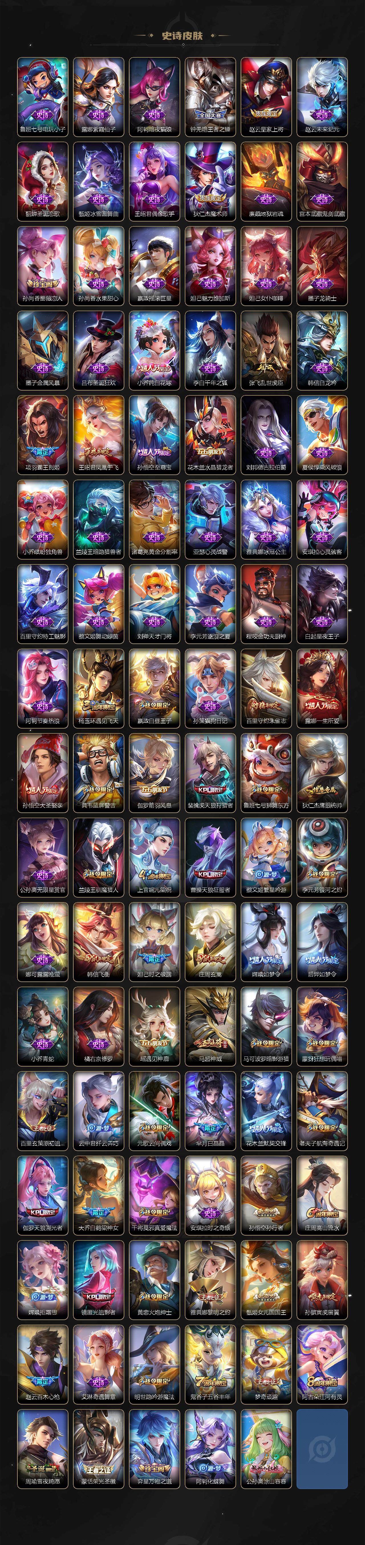 上官婉儿梁祝,诸葛亮时雨天司,马超神威,庄周玄嵩,韩信飞衡,伽罗太华,曹操天狼征服者,裴擒虎天狼狩猎者,伽罗天狼溯光者,百里玄策白虎志,百里守约朱雀志,王昭君凤凰于飞,项羽霸王别姬,小乔纯白花嫁,孙悟空大圣娶亲,露娜一生所爱,花木兰默契交锋,兰陵王默契交锋,后羿如梦令,嫦娥如梦令,孙悟空至尊宝,雅典娜神奇女侠,妲己时之彼端,芈月白晶晶,大乔白鹤梁神女,孙尚香异界灵契,孙悟空孙行者,甄姬女儿国国王,镜匿光追影者,孙膑寅虎·展翼,瑶时之祈愿,赵云百木心枪,澜愿照·九州拓
