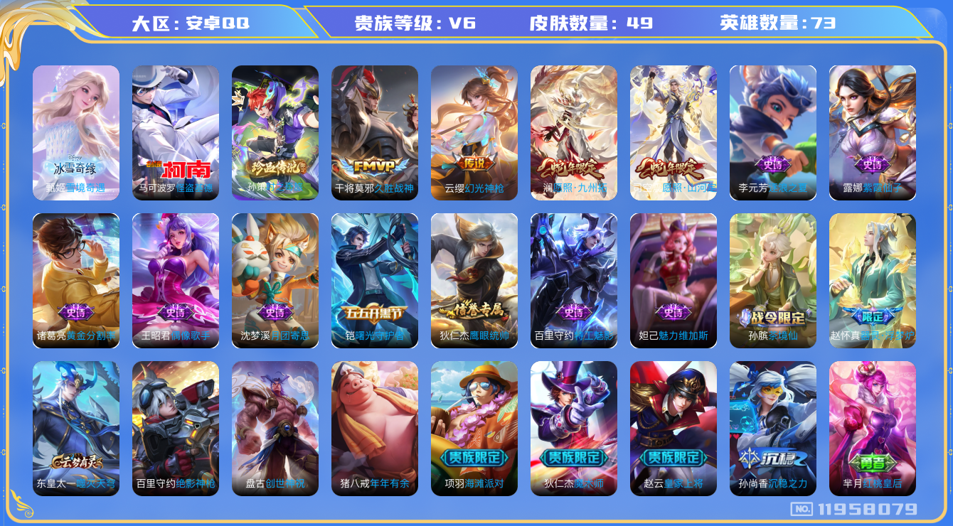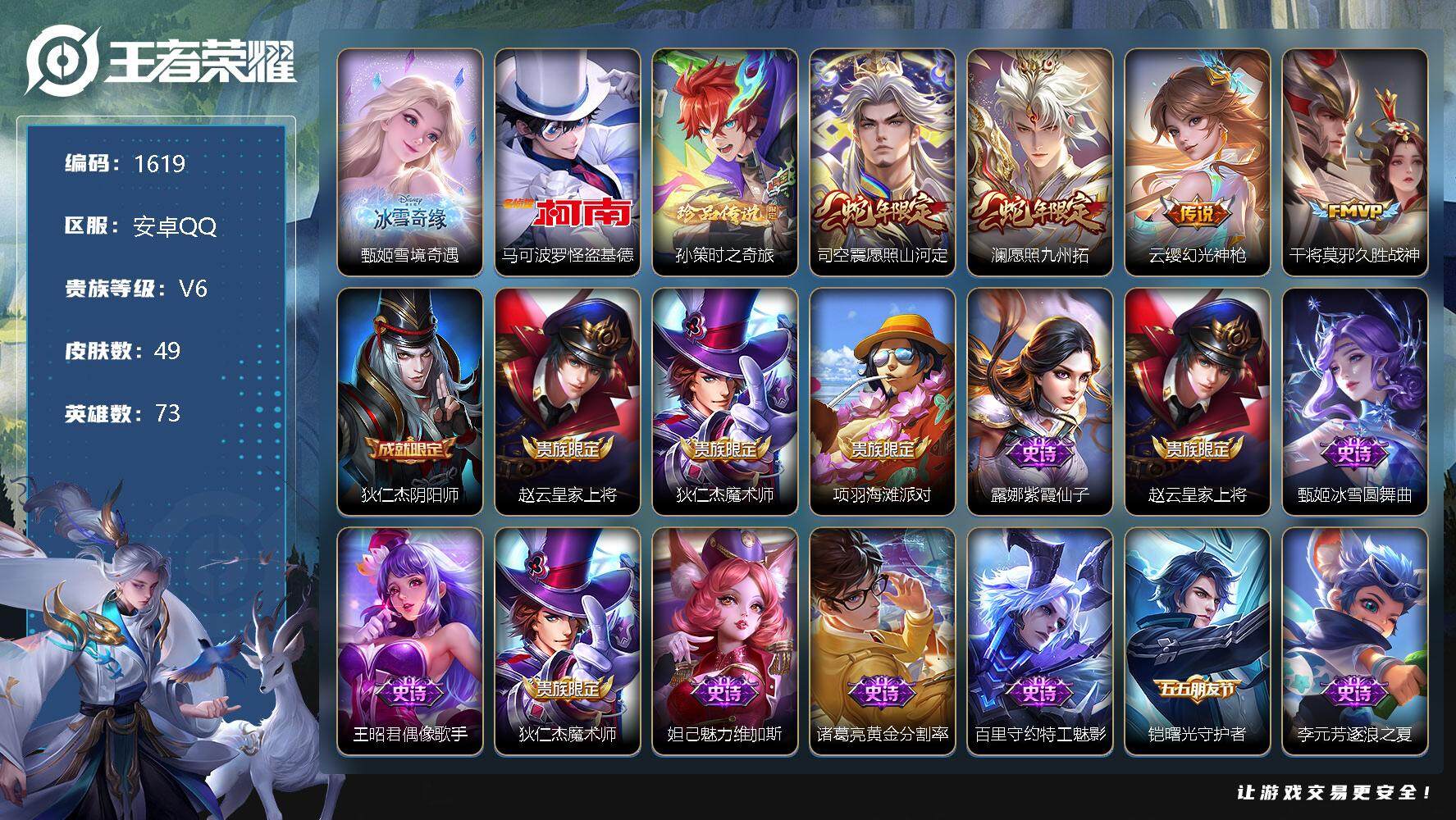 [11958079]【商品标题】:安卓Q-V5-最强王者段位-73英雄-49皮肤-0典藏-0珍品无双-1无双-2珍品传说-4传说-14史诗