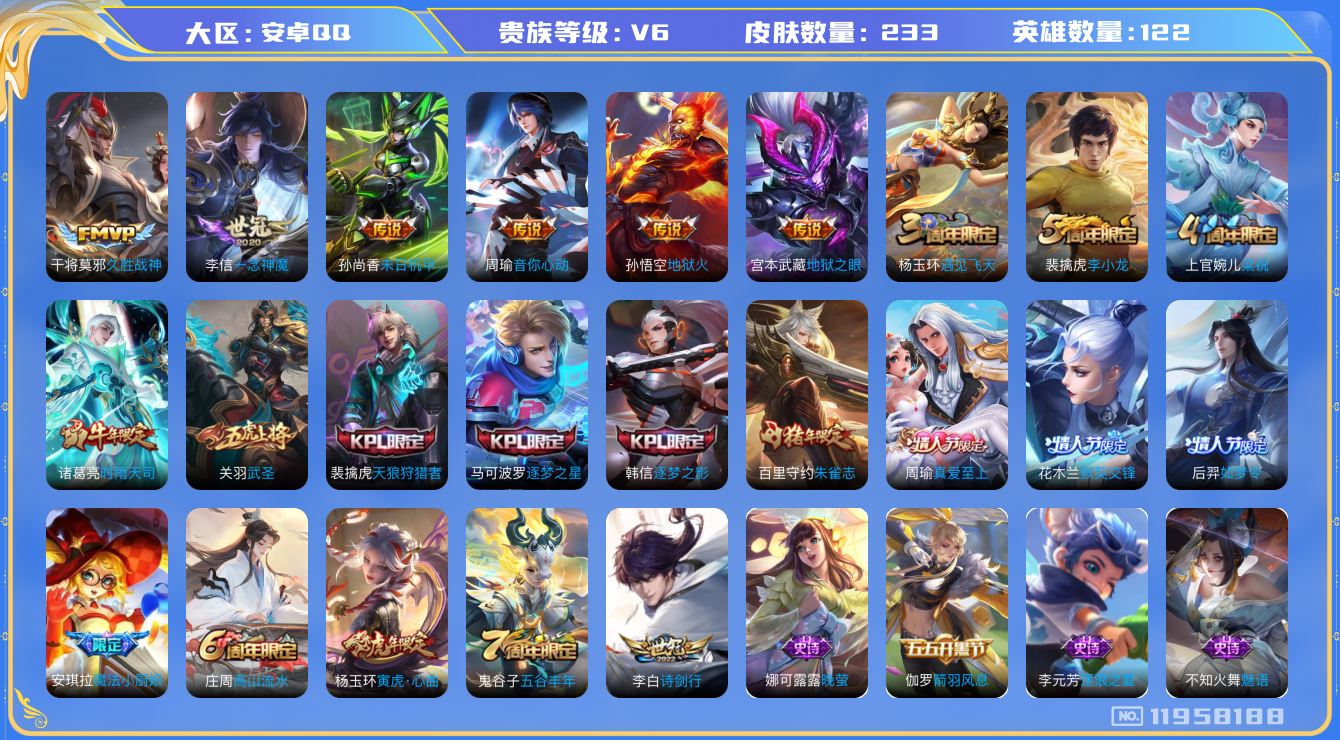 [11958188]【商品标题】:安卓Q-V6-荣耀黄金II段位-122英雄-233皮肤-0典藏-0珍品无双-0无双-0珍品传说-9传说-70史诗