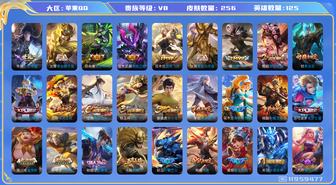 [11959477]V8 10传说 125英雄 256皮肤 典藏英雄武则天 可修改实名 优质装备:黄金狮子座,冠军飞将,云鹰飞将(小将军),黄金白羊座,一念神魔,末日机甲-孙尚香(绿蚂蚱),地狱之眼 珍宝阁皮:优雅恋人,女武神 限定皮:至尊宝,凤求凰(白切鸡),神威(电光马子),飞衡(韩信年限),遇见飞天,高山流水,青龙志(铠年限),冰锋战神,天狼运算者,游园惊梦,逐梦之星,李小龙,永曜之星,辉光之辰,霸王别姬-虞姬,孙行者,猪悟能,引擎之心,青春决赛季 史诗皮:星界战将,龙之律动,百相守梦-百里守约,百相守梦-黄忠,紫霞仙子,苍穹之光,黄金分割率,特工魅影,千年之狐,永昼,魅语,蒙恬荣光圣徽,无限星赏官,冰冠公主,偶像歌手,晚萤,龙骑士(小龙虾),末日机甲-吕布,猫狗日记-孙策,猫狗日记-大乔,乱世虎臣,节奏热浪,修罗,女仆咖啡,摇滚巨星,水果甜心,天才门将,星夜王子,心灵骇客,功夫厨神,德古拉伯爵,暗隐猎兽者,幽灵船长,鬼剑武藏,心灵战警,舞动绿茵,地狱岩魂,纤云弄巧,缤纷独角兽,乘风破浪,逐浪之夏,水晶猎龙者,热力回旋,箭羽风息,金属风暴,原初追逐者,圣诞狂欢,圣诞恋歌,鹰眼统帅,暗夜贵公子,黎明之约,奇遇舞章,未来纪元-赵云