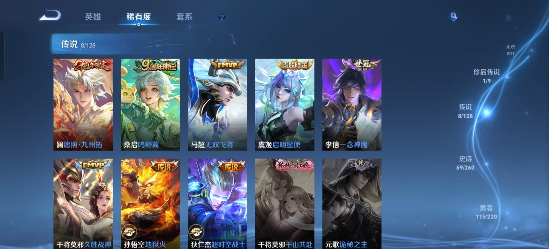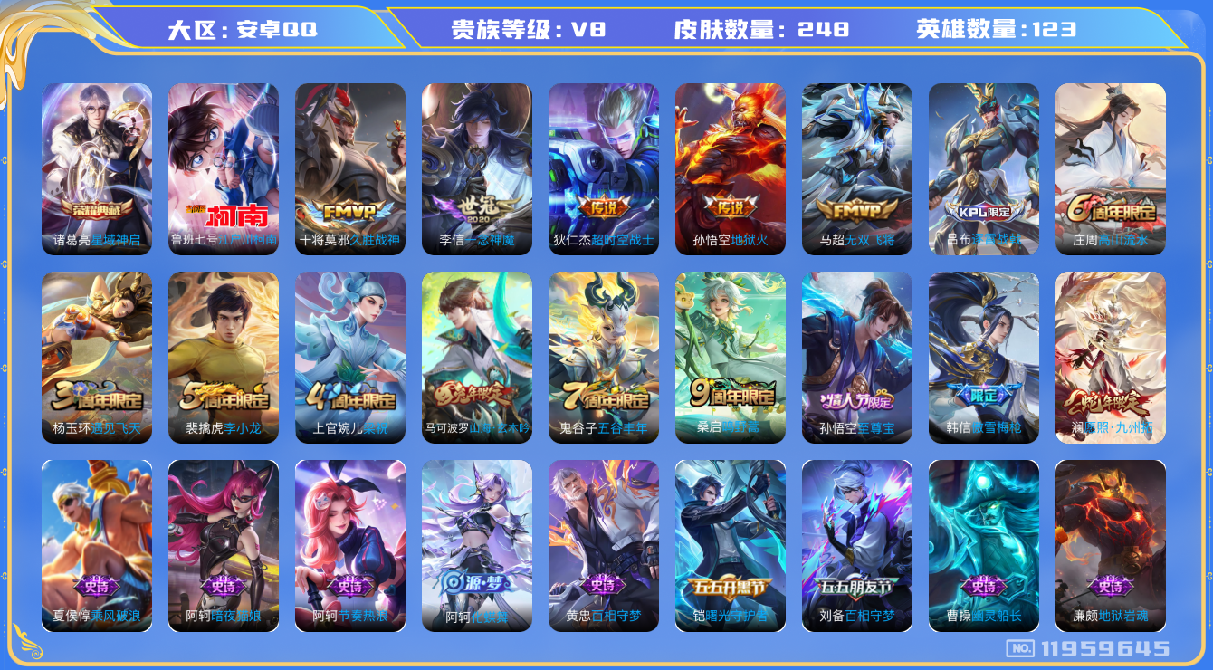 - [12294750]V7 1典藏 1珍品传说 8传说 125英雄 277皮肤 可修改实名 优质装备:鸣剑·曳影,怪盗基德,炽阳神光,一念神魔,千山共赴,涂山容容 传说皮:吕布曦玄引,幻光神枪 珍宝阁皮:万物之道,蔷薇恋人,玩趣恶龙 限定皮:愿照·九州拓(澜年限),愿照·山河定(司空震年限),逐霄战戟,鸣野蒿,神威(电光马子),高山流水,五谷丰年,冰锋战神,御风骁将(吕布年限),李小龙,圣诞老人,默契交锋-花木兰,孙行者,猪悟能 史诗皮:器灵·浮梦炉,糖绘人间,龙之律动,茶境仙,蒙犽顽岩魄,破空之剑,百相守梦-黄忠,星界战将,紫霞仙子,黄金分割率,特工魅影,千年之狐,永昼,江河有灵,高渐离燃音魔法,蒙恬荣光圣徽,魅语,偶像歌手,电玩·爆裂旋风,末日机甲-吕布,猫狗日记-孙策,乱世虎臣,节奏热浪,摇滚巨星,水果甜心,绅士熊喵,天才门将,星夜王子,时之奇旅-安琪拉,功夫厨神,德古拉伯爵,暗隐猎兽者,幽灵船长,鬼剑武藏,地狱岩魂,缤纷独角兽,乘风破浪,逐浪之夏,月团寄思,水晶猎龙者,曙光守护者,箭羽风息,金属风暴,原初追逐者,圣诞狂欢,鹰眼统帅,魅力维加斯,黎明之约,未来纪元-赵云