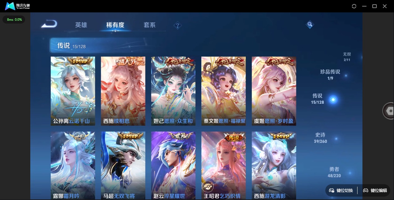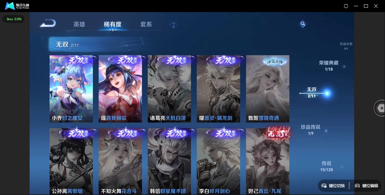 - [11445431]V8 2典藏 10传说 124英雄 308皮肤 可修改实名 荣耀水晶:鸣剑·曳影,全息碎影(猴子典藏) 传说皮:祥瑞亨通,幻光神枪,黄金射手座,零号·赤焰,云鹰飞将(小将军),超时空战士-狄仁杰,妄想实况,霜月吟 珍宝阁皮:优雅恋人,蔷薇恋人 限定皮:愿照·九州拓(澜年限),逐霄战戟,至尊宝,遇见飞天,高山流水,游园惊梦,梁祝,烈魂,天狼征服者,李小龙,辉光之辰,霸王别姬-虞姬,默契交锋-花木兰,猪悟能,大圣娶亲 史诗皮:器灵·浮梦炉,苍穹之光,白龙吟,黄金分割率,特工魅影,千年之狐,永昼,江河有灵,百解令(蒙犽),蒙恬荣光圣徽,冰冠公主,偶像歌手,晚萤,无限星赏官,电玩·爆裂旋风,时之恋人-孙尚香,乱世虎臣,节奏热浪,修罗,女仆咖啡,摇滚巨星,水果甜心,绅士熊喵,星夜王子,心灵骇客,功夫厨神,德古拉伯爵,暗隐猎兽者,幽灵船长,心灵战警,舞动绿茵,纤云弄巧,繁星吟游(呼啦呼啦),拒霜思,缤纷独角兽,乘风破浪,逐浪之夏,水晶猎龙者,曙光守护者,金属风暴,原初追逐者,圣诞狂欢,圣诞恋歌,鹰眼统帅,魅力维加斯,黎明之约,未来纪元-赵云