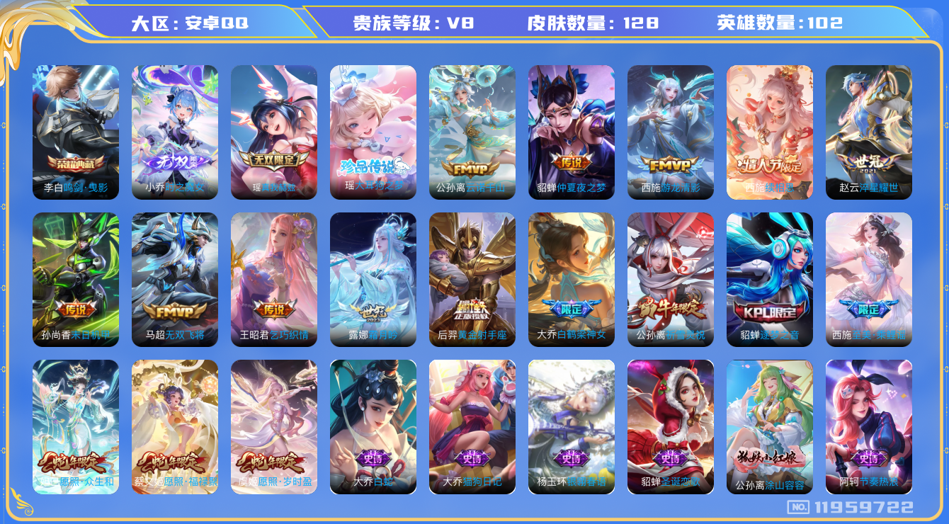 - [12200670]V10 3典藏 1珍品无双 5无双 4珍品传说 26传说 126英雄 221皮肤 可修改实名 优质装备:馥梦繁花,天鹅之梦(小乔典藏),幻阙歌(貂蝉典藏),真我赫兹(瑶)(瑶无双),小乔时之魔女(小乔无双),花合斗,离恨烟(公孙离无双),雪境奇遇-甄姬,最初的交响(伽罗典藏),器灵·落星盏,酷洛米之心,大耳狗之梦,朽木白哉,猫影幻舞,久胜战神,仲夏夜之梦(大飞蛾),乞巧织情,花朝如约(花篮子),山海·琳琅生(小乔年限),浮生妄,灼幽烈阳,妄想奇谈,大乔-时之奇旅,霜月吟,艾琳觅芳踪,千劫归真 传说皮:貂蝉曦玄引 限定皮:愿照·福禄聚(蔡文姬年限),愿照·岁时盈(虞姬年限),愿照·众生和(妲己年限),映山客,鸣野蒿,太华(伽罗年限),异界灵契(白毛香),绯月行,至美·乘鲤谣,至美·化雀舞,岱宗(典韦年限),虎魄,逐梦之音,祈雪灵祝(雪兔子),寅虎·心曲(虎婆),时之祈愿-瑶(瑶传限),玉兔公主 史诗皮:鸭鸭历险记-刘禅,化蝶舞,龙之律动,灵蛊蚀心,星界战将,百相守梦-周瑜,茶境仙,破空之剑,战舞者,曹操夜都魔契,织梦人,紫霞仙子,特工魅影,千年之狐,白蛇,浮梦罗烟,青蛇,魅语,晚萤,偶像歌手,银翎春语,龙骑士(小龙虾),暗夜猫娘,末日机甲-吕布,猫狗日记-大乔,乱世虎臣,节奏热浪,女仆咖啡,摇滚巨星,水果甜心,天才门将,星夜王子,心灵骇客,时之奇旅-安琪拉,德古拉伯爵,鬼剑武藏,舞动绿茵,诗语江南,拒霜思,缤纷独角兽,乘风破浪,曙光守护者,箭羽风息,唤灵魅影,圣诞狂欢,圣诞恋歌,魅力维加斯,天秀·音浪,未来纪元-赵云