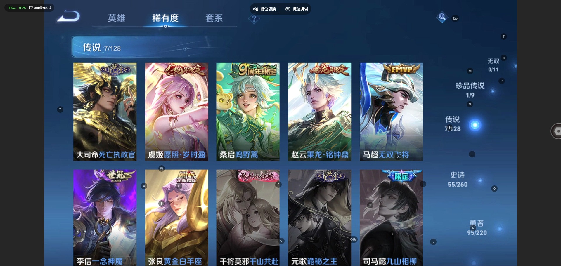 - [11609233]V7 3典藏 1珍品传说 1传说 123英雄 188皮肤 可修改实名 优质装备:天鹅之梦(小乔典藏),无限飓风号(高达),银白咏叹调(倪克斯侍卫) 珍品传说:兔狲·蓬尾 传说皮:典韦战鼓燎原 珍宝阁皮:胡桃夹子 限定皮:逐霄战戟,玄嵩(庄周年限),高山流水,五谷丰年,梁祝,李小龙,如梦令-后羿,猪悟能 史诗皮:鸭鸭历险记-刘禅,龙之律动,石田雨龙,蔬乡物语(鲁班七号),苍穹之光,电玩小子(小书包),电玩·爆裂旋风,蒙恬荣光圣徽,偶像歌手,龙骑士(小龙虾),暗夜猫娘,青蛇,猫狗日记-孙策,时之恋人-孙尚香,女仆咖啡,摇滚巨星,水果甜心,绅士熊喵,天才门将,心灵骇客,暗隐猎兽者,鬼剑武藏,乐园奇幻夜,地狱岩魂,繁星吟游(呼啦呼啦),缤纷独角兽,逐浪之夏,箭羽风息,金属风暴,原初追逐者,圣诞狂欢,鹰眼统帅,魅力维加斯,黎明之约,无心