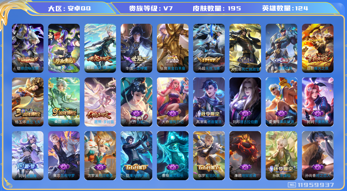 [11959937]V7 1典藏 1珍品传说 7传说 124英雄 195皮肤 可修改实名 优质装备:银白咏叹调(倪克斯侍卫),黄金白羊座,一念神魔,无双飞将 珍品传说:时之奇旅-孙策 传说皮:乘龙·铭钟鼎(赵云年限),死亡执政官 珍宝阁皮:妄想食味 限定皮:愿照·岁时盈(虞姬年限),逐霄战戟,鸣野蒿,遇见飞天,辉光之辰 史诗皮:鸭鸭历险记-刘禅,器灵·浮梦炉,化蝶舞,星界战将,龙之律动,百相守梦-周瑜,茶境仙,破空之剑,百相守梦-百里守约,百相守梦-黄忠,苍穹之光,特工魅影,千年之狐,江河有灵,百解令(蒙犽),高渐离燃音魔法,蒙恬荣光圣徽,冰冠公主,偶像歌手,白蛇,猫狗日记-大乔,时之恋人-孙尚香,节奏热浪,女仆咖啡,水果甜心,绅士熊喵,天才门将,星夜王子,功夫厨神,德古拉伯爵,幽灵船长,鬼剑武藏,舞动绿茵,地狱岩魂,乘风破浪,月团寄思,水晶猎龙者,曙光守护者,箭羽风息,金属风暴,圣诞狂欢,圣诞恋歌,鹰眼统帅,魅力维加斯