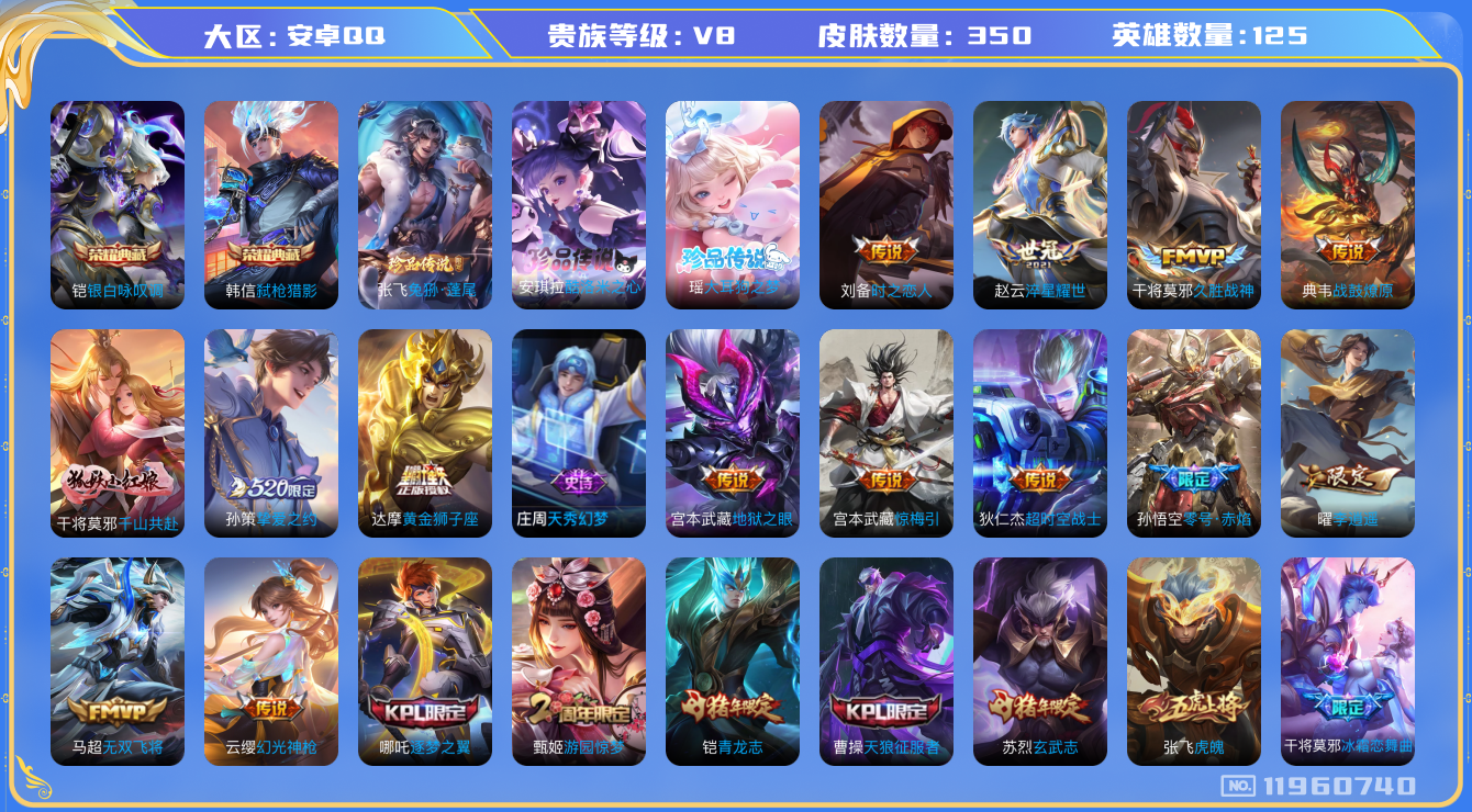 [11960740]V8 2典藏 3珍品传说 25传说 125英雄 350皮肤 可修改实名 优质装备:银白咏叹调(倪克斯侍卫),弑枪猎影(韩信典藏),酷洛米之心,大耳狗之梦,黄金狮子座,久胜战神,零号·赤焰,地狱之眼,李逍遥,时之恋人-刘备(电焊工),淬星耀世,超时空战士-狄仁杰,挚爱之约,无双飞将,天秀幻梦,惊梅引,千山共赴,涂山容容 珍品传说:兔狲·蓬尾 传说皮:典韦战鼓燎原,幻光神枪 珍宝阁皮:万物之道,女武神,玩趣恶龙 限定皮:愿照·山河定(司空震年限),愿照·众生和(妲己年限),愿照·千秋盛(女娲年限),逐霄战戟,鸣野蒿,至尊宝,白虎志(电光耗子),凤求凰(白切鸡),魔法小厨娘,飞衡(韩信年限),无限倾心-项羽,高山流水,怒海麟威,五谷丰年,青龙志(铠年限),武圣,游园惊梦,梁祝,天狼狩猎者,逐梦之翼,虎魄,天狼征服者,李小龙,玄武志(苏烈年限),猪悟能,大圣娶亲,引擎之心,冰霜恋舞曲,深海之息(深海大菠萝) 史诗皮:鸭鸭历险记-刘禅,器灵·浮梦炉,化蝶舞,灵蛊蚀心,星界战将,谪仙醉月,龙之律动,布丁狗之誓,石田雨龙,百相守梦-周瑜,茶境仙,撼地雄心,破空之剑,芈月浮光幕影,百相守梦-黄忠,织梦人,苍穹之光,黄金分割率,特工魅影,千年之狐,江河有灵,鹤归松栖(赵怀真),魅语,蒙恬荣光圣徽,青蛇,偶像歌手,电玩·爆裂旋风,龙骑士(小龙虾),末日机甲-吕布,猫狗日记-孙策,猫狗日记-大乔,乱世虎臣,节奏热浪,修罗,女仆咖啡,摇滚巨星,水果甜心,绅士熊喵,天才门将,星夜王子,心灵骇客,功夫厨神,德古拉伯爵,暗隐猎兽者,幽灵船长,鬼剑武藏,暗渊魔法,心灵战警,天秀·启明,地狱岩魂,纤云弄巧,拒霜思,缤纷独角兽,乘风破浪,逐浪之夏,水晶猎龙者,曙光守护者,箭羽风息,金属风暴,原初追逐者,圣诞狂欢,圣诞恋歌,鹰眼统帅,暗夜贵公子,魅力维加斯,黎明之约,雪上飞焰,赏金猎手,天秀·音浪,天秀幻梦,无心,未来纪元-赵云