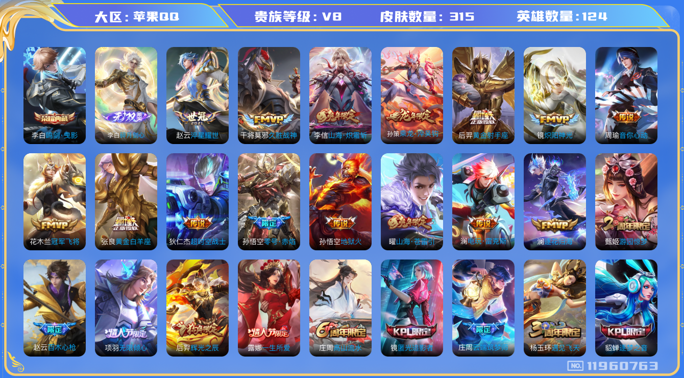 [11960763]V7 1典藏 1无双 21传说 124英雄 315皮肤 可修改实名 优质装备:鸣剑·曳影,碎月剑心(李白无双),黄金射手座,冠军飞将,黄金白羊座,久胜战神,炽阳神光,地狱火,零号·赤焰,音你心动-周瑜,淬星耀世,超时空战士-狄仁杰,山海·炽霜斩(李信年限),山海·苍雷引(电光曜子),电玩·雷克斯,澜逐花归海 传说皮:乘龙·淬吴钩(孙策年限) 珍宝阁皮:万物之道,优雅恋人,蔷薇恋人,女武神 限定皮:鸣野蒿,至尊宝,白虎志(电光耗子),傲雪梅枪,神威(电光马子),无限倾心-项羽,遇见飞天,高山流水,五谷丰年,冰锋战神,武圣,游园惊梦,梁祝,逐梦之音,李小龙,逐梦之影,朱雀志(守约年限),辉光之辰,霸王别姬-虞姬,孙行者,猪悟能,一生所爱,大圣娶亲,云端筑梦师,美猴王,匿光追影者,寅虎·赤拳(老虎年限),百木心枪,山海·玄木吟(马可年限) 史诗皮:石田雨龙,紫霞仙子,苍穹之光,电玩小子(小书包),白龙吟,黄金分割率,特工魅影,千年之狐,永昼,江河有灵,雪夜绮愿(周瑜),魅语,百解令(蒙犽),蒙恬荣光圣徽,冰冠公主,青蛇,偶像歌手,晚萤,电玩·爆裂旋风,百相守梦(刘备),暗夜猫娘,龙骑士(小龙虾),末日机甲-吕布,猫狗日记-孙策,乱世虎臣,节奏热浪,修罗,水果甜心,天才门将,星夜王子,心灵骇客,功夫厨神,德古拉伯爵,暗隐猎兽者,幽灵船长,鬼剑武藏,心灵战警,乐园奇幻夜,天秀·启明,舞动绿茵,地狱岩魂,纤云弄巧,繁星吟游(呼啦呼啦),缤纷独角兽,乘风破浪,逐浪之夏,水晶猎龙者,曙光守护者,箭羽风息,金属风暴,原初追逐者,圣诞狂欢,圣诞恋歌,鹰眼统帅,魅力维加斯,黎明之约,赏金猎手,无心,未来纪元-赵云