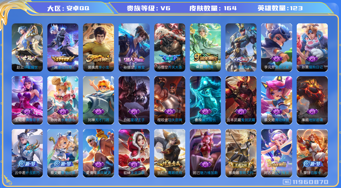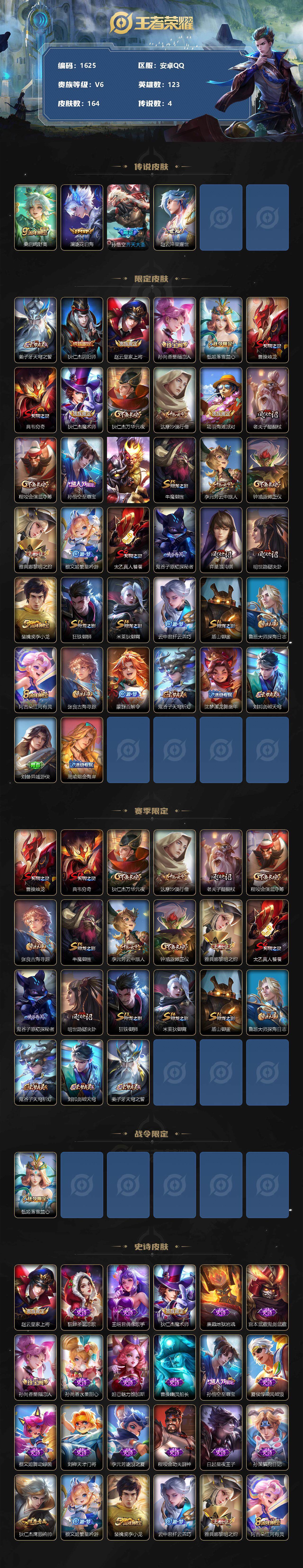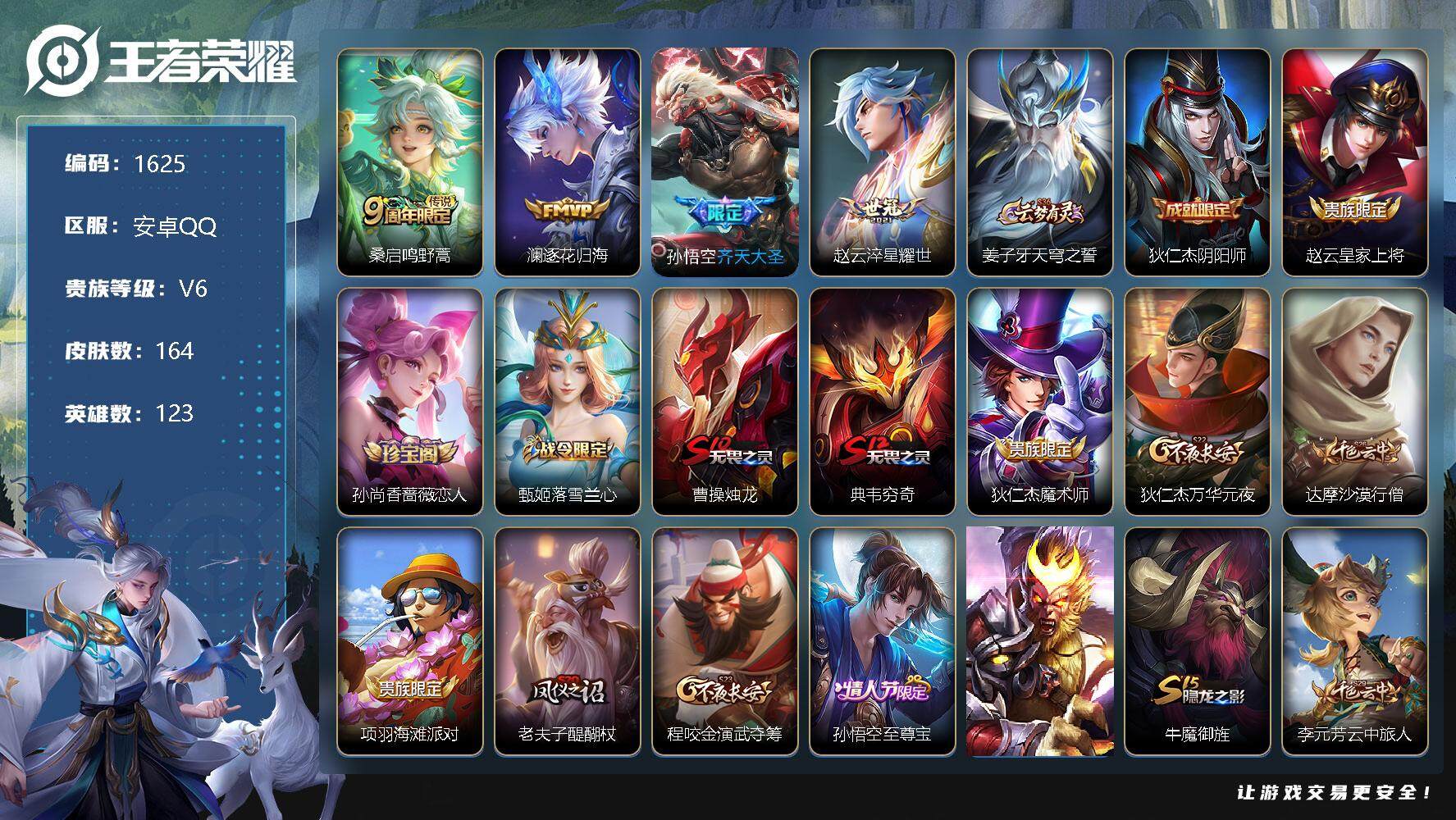 [11960870]【商品标题】:安卓Q-V6-最强王者段位-123英雄-164皮肤-0典藏-0珍品无双-0无双-0珍品传说-4传说-31史诗