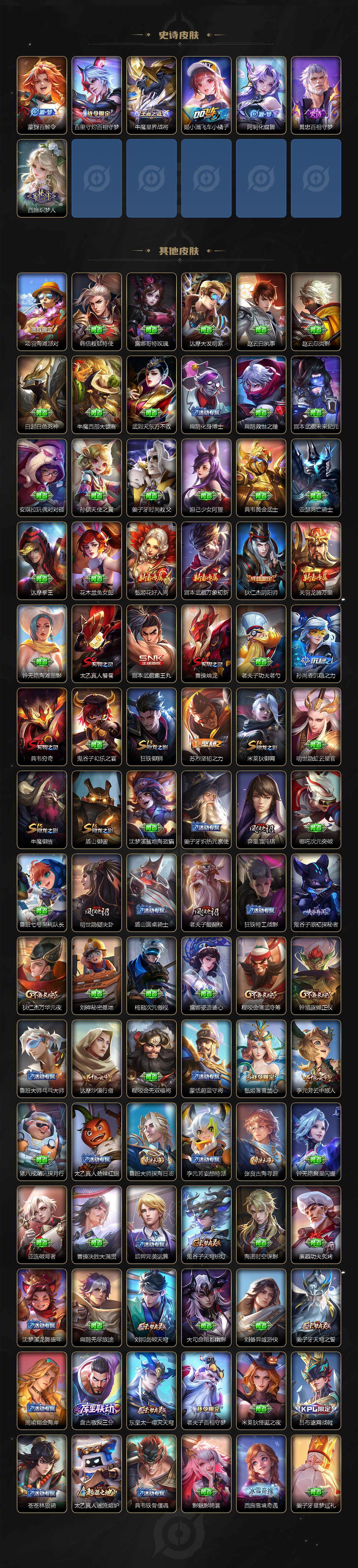 【史诗皮肤】:赵云皇家上将,貂蝉圣诞恋歌,王昭君偶像歌手,狄仁杰魔术师,廉颇地狱岩魂,宫本武藏鬼剑武藏,孙尚香蔷薇恋人,孙尚香水果甜心,妲己魅力维加斯,曹操幽灵船长,孙悟空至尊宝,夏侯惇乘风破浪,蔡文姬舞动绿茵,刘禅天才门将,李元芳逐浪之夏,程咬金功夫厨神,白起星夜王子,孙策猫狗日记,狄仁杰鹰眼统帅,蔡文姬繁星吟游,裴擒虎李小龙,云中君纤云弄巧,雅典娜黎明之约,阿古朵江河有灵,蒙犽百解令,百里守约百相守梦,牛魔星界战将,姬小满飞车小橘子,阿轲化蝶舞,黄忠百相守梦,西施织梦人