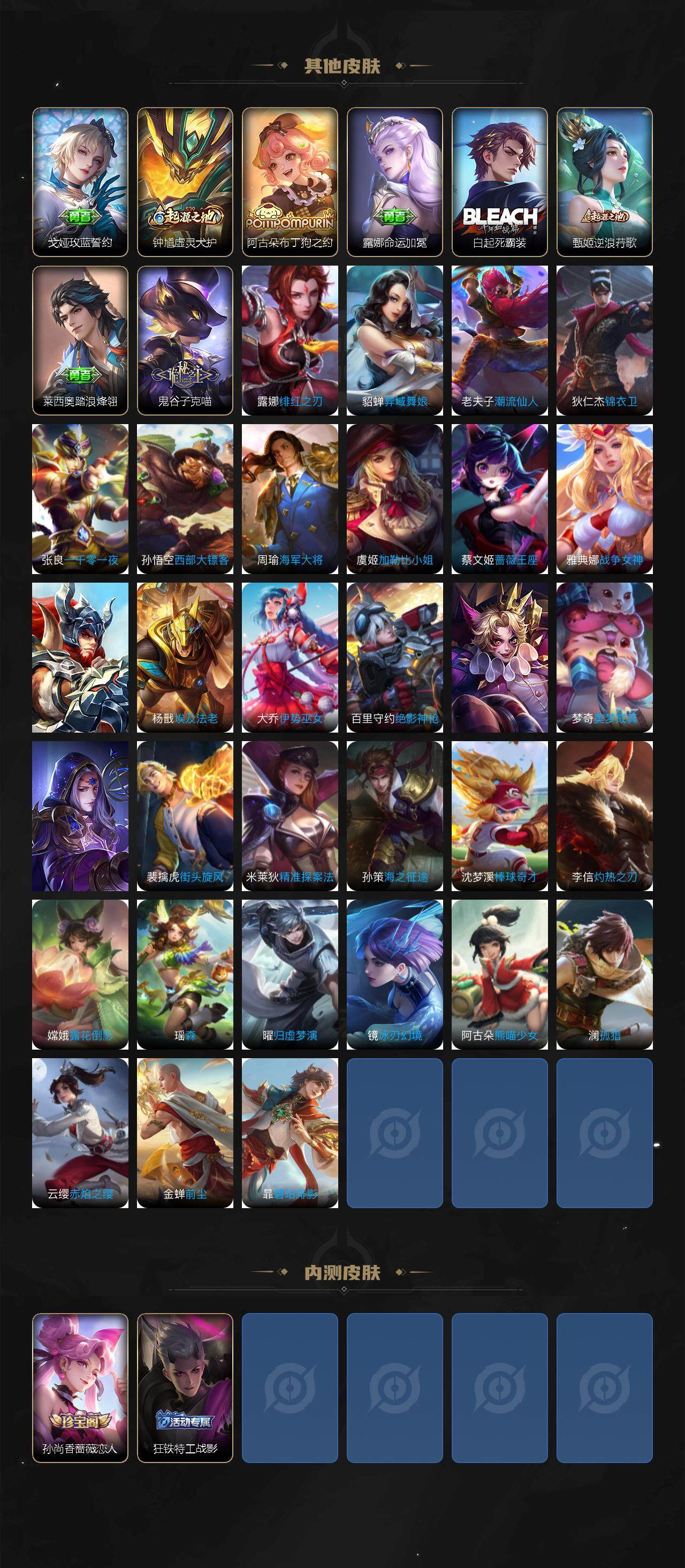 【其他皮肤】:项羽海滩派对,韩信教廷特使,露娜哥特玫瑰,达摩大发明家,赵云白执事,赵云忍炎影,白起白色死神,牛魔西部大镖客,武则天东方不败,扁鹊化身博士,扁鹊救世之瞳,宫本武藏未来纪元,安琪拉玩偶对对碰,孙膑天使之翼,姜子牙时尚教父,妲己少女阿狸,典韦黄金武士,亚瑟死亡骑士,达摩拳王,花木兰兔女郎,甄姬花好人间,宫本武藏万象初新,狄仁杰阴阳师,关羽龙腾万里,钟无艳海滩丽影,太乙真人饕餮,宫本武藏霸王丸,曹操烛龙,老夫子功夫老