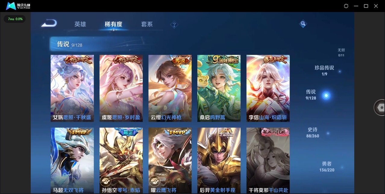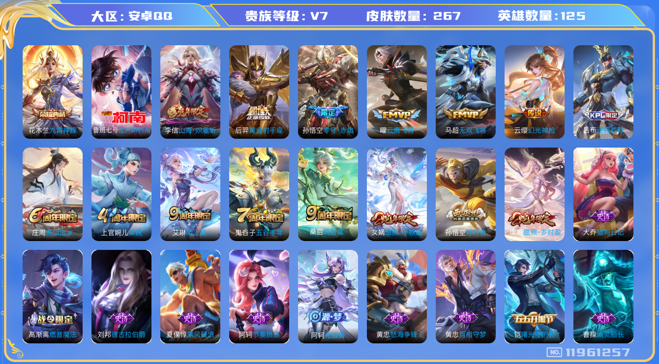 [11961257]V7 1典藏 1珍品传说 9传说 125英雄 267皮肤 可修改实名 优质装备:九霄神辉(木兰典藏),江户川柯南,黄金射手座,云鹰飞将(小将军),零号·赤焰,无双飞将,山海·炽霜斩(李信年限),涂山容容 传说皮:幻光神枪 珍宝阁皮:万物之道,优雅恋人,女武神 限定皮:愿照·岁时盈(虞姬年限),愿照·千秋盛(女娲年限),逐霄战戟,陌上桑,鸣野蒿,高山流水,五谷丰年,梁祝,孙行者 史诗皮:鸭鸭历险记-刘禅,器灵·浮梦炉,化蝶舞,星界战将,谪仙醉月,龙之律动,石田雨龙,茶境仙,怒海争锋,炽弈燎原,破空之剑,战舞者,芈月浮光幕影,琥珀纪元伽罗,蔬乡物语(鲁班七号),百相守梦-百里守约,星界特工,百相守梦-黄忠,紫霞仙子,电玩小子(小书包),黄金分割率,特工魅影,魅语,百解令(蒙犽),高渐离燃音魔法,蒙恬荣光圣徽,偶像歌手,电玩·爆裂旋风,末日机甲-吕布,猫狗日记-孙策,猫狗日记-大乔,乱世虎臣,节奏热浪,修罗,女仆咖啡,水果甜心,天才门将,星夜王子,心灵骇客,功夫厨神,德古拉伯爵,暗隐猎兽者,幽灵船长,鬼剑武藏,心灵战警,天秀·启明,舞动绿茵,地狱岩魂,纤云弄巧,拒霜思,缤纷独角兽,乘风破浪,逐浪之夏,水晶猎龙者,曙光守护者,金属风暴,原初追逐者,圣诞狂欢,圣诞恋歌,鹰眼统帅,暗夜贵公子,魅力维加斯,黎明之约,赏金猎手,无心,未来纪元-赵云