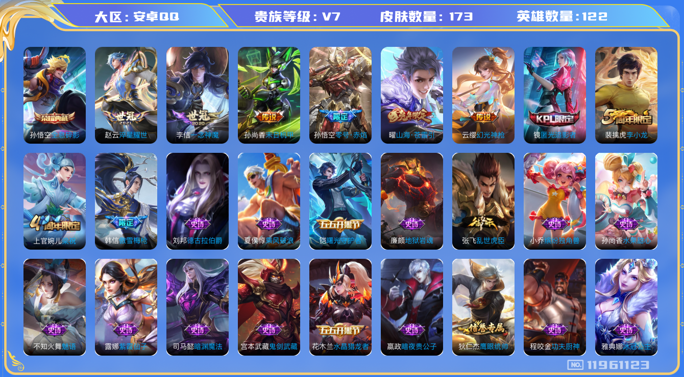 - [12292580]V7 1无双 7传说 100英雄 127皮肤 可修改实名 优质装备:器灵·螭龙剑,久胜战神 传说皮:幻光神枪 珍宝阁皮:妄想食味 限定皮:愿照·九州拓(澜年限),愿照·岁时盈(虞姬年限),愿照·众生和(妲己年限),愿照·千秋盛(女娲年限),逐霄战戟,陌上桑,鸣野蒿,至尊宝,神威(电光马子),至美·乘鲤谣 史诗皮:化蝶舞,龙之律动,战舞者,蒙犽顽岩魄,百相守梦-黄忠,织梦人,遇见神鹿,偶像歌手,末日机甲-吕布,时之恋人-孙尚香,女仆咖啡,水果甜心,心灵骇客,时之奇旅-安琪拉,功夫厨神,暗隐猎兽者,鬼剑武藏,诗语江南,缤纷独角兽,逐浪之夏,曙光守护者,唤灵魅影,金属风暴,圣诞恋歌,鹰眼统帅,魅力维加斯
