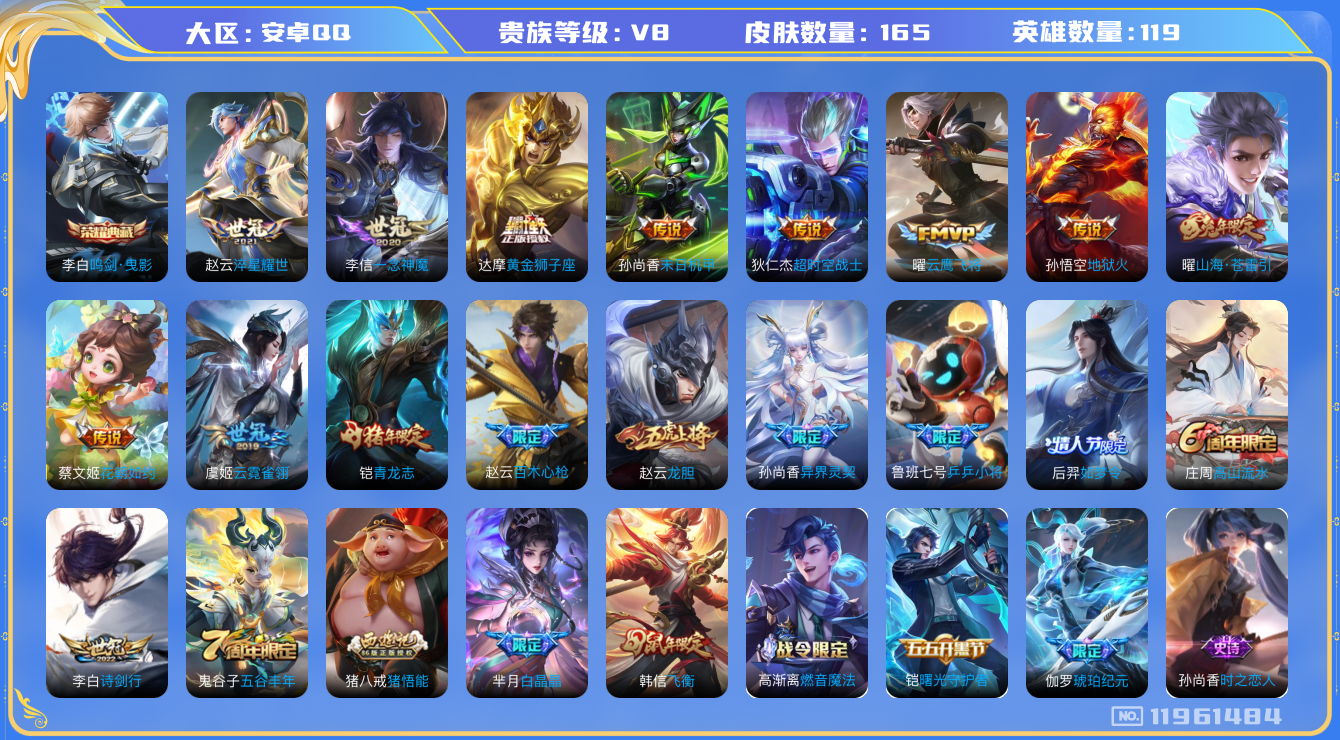 - PX_2093808-贵族8/皮肤293/典藏3/传说9/史诗75/英雄125/鸣剑曳影/星域神启/银白咏叹调/安琪拉酷洛米之心/女武神/玩趣恶龙/特工战影/黄金白羊座/一念神魔/启明星使/寅虎赤拳/无限倾心男/惊梅引/影龙天霄/桑启鸣野蒿/虞姬愿照岁时盈/大乔绒语心约/姜子牙天穹之誓/杨戬破阵退雄兵/狄仁杰阴阳师/赵云皇家上将/墨子神迹守卫/乒乒小将/玩趣恶龙/钟无艳超时空战士/扁鹊奇幻香踪/芈