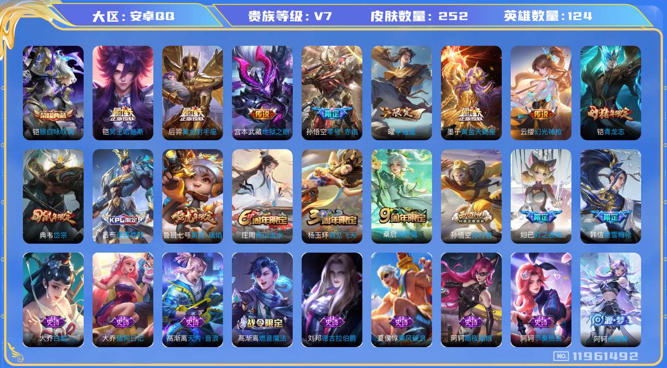[11961492]V7 1典藏 9传说 124英雄 252皮肤 可修改实名 优质装备:银白咏叹调(倪克斯侍卫),黄金射手座,零号·赤焰,地狱之眼,李逍遥,黄金天蝎座,涂山容容 传说皮:铠冥王哈迪斯,幻光神枪 珍宝阁皮:万物之道,蔷薇恋人 限定皮:逐霄战戟,鸣野蒿,傲雪梅枪,时之彼端,遇见飞天,高山流水,青龙志(铠年限),岱宗(典韦年限),孙行者,寅虎·瑞焰(虎皮蛋子) 史诗皮:化蝶舞,星界战将,谪仙醉月,龙之律动,茶境仙,破空之剑,蒙犽顽岩魄,埋骨钱,琥珀纪元伽罗,蔬乡物语(鲁班七号),百相守梦-百里守约,织梦人,紫霞仙子,黄金分割率,特工魅影,江河有灵,百解令(蒙犽),高渐离燃音魔法,蒙恬荣光圣徽,白蛇,电玩·爆裂旋风,暗夜猫娘,龙骑士(小龙虾),末日机甲-吕布,猫狗日记-孙策,猫狗日记-大乔,节奏热浪,修罗,女仆咖啡,摇滚巨星,水果甜心,绅士熊喵,星夜王子,心灵骇客,功夫厨神,德古拉伯爵,暗隐猎兽者,幽灵船长,鬼剑武藏,心灵战警,乐园奇幻夜,天秀·启明,舞动绿茵,地狱岩魂,纤云弄巧,拒霜思,缤纷独角兽,乘风破浪,逐浪之夏,水晶猎龙者,曙光守护者,箭羽风息,唤灵魅影,金属风暴,圣诞狂欢,圣诞恋歌,鹰眼统帅,暗夜贵公子,魅力维加斯,黎明之约,天秀·音浪,无心,未来纪元-赵云