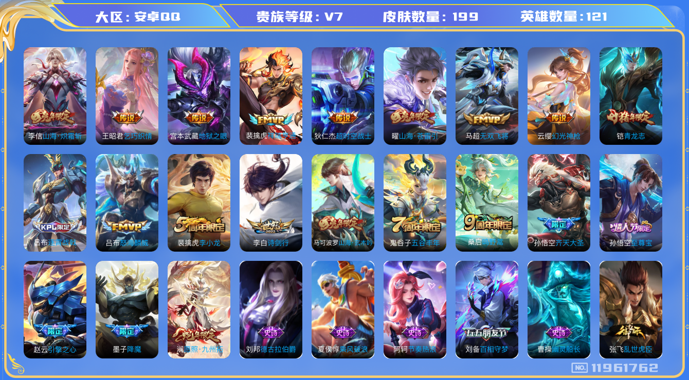 [11961762]V7 13传说 121英雄 199皮肤 可修改实名 优质装备:地狱之眼,乞巧织情,超时空战士-狄仁杰,无双飞将,山海·炽霜斩(李信年限),山海·苍雷引(电光曜子) 传说皮:祥瑞亨通,幻光神枪 珍宝阁皮:蔷薇恋人 限定皮:愿照·九州拓(澜年限),逐霄战戟,鸣野蒿,至尊宝,诗剑行,齐天大圣,怒海麟威,降魔,五谷丰年,青龙志(铠年限),李小龙,引擎之心,山海·玄木吟(马可年限) 史诗皮:器灵·浮梦炉,星界战将,龙之律动,百相守梦-百里守约,黄金分割率,永昼,江河有灵,百解令(蒙犽),蒙恬荣光圣徽,晚萤,电玩·爆裂旋风,百相守梦(刘备),末日机甲-吕布,猫狗日记-孙策,乱世虎臣,节奏热浪,修罗,女仆咖啡,水果甜心,天才门将,星夜王子,功夫厨神,德古拉伯爵,暗隐猎兽者,幽灵船长,鬼剑武藏,天秀·启明,舞动绿茵,纤云弄巧,拒霜思,缤纷独角兽,乘风破浪,逐浪之夏,水晶猎龙者,金属风暴,圣诞恋歌,鹰眼统帅,魅力维加斯,黎明之约,无心,未来纪元-赵云