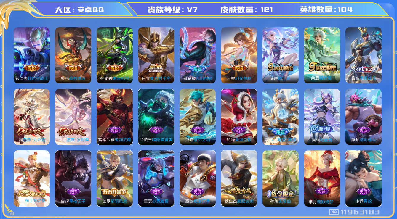 [11963183]V7 9传说 104英雄 121皮肤 可修改实名 优质装备:黄金射手座,末日机甲-孙尚香(绿蚂蚱),超时空战士-狄仁杰 传说皮:典韦战鼓燎原,九山相柳,幻光神枪 限定皮:愿照·九州拓(澜年限),愿照·岁时盈(虞姬年限),逐霄战戟,陌上桑,鸣野蒿 史诗皮:鸭鸭历险记-刘禅,器灵·浮梦炉,瑰影绮梦,化蝶舞,龙之律动,藏狐·褐绒,布丁狗之誓,石田雨龙,百相守梦-周瑜,茶境仙,撼地雄心,破空之剑,百相守梦-百里守约,特工魅影,青蛇,末日机甲-吕布,猫狗日记-孙策,时之恋人-孙尚香,摇滚巨星,水果甜心,星夜王子,暗隐猎兽者,鬼剑武藏,暗渊魔法,心灵战警,舞动绿茵,逐浪之夏,箭羽风息,圣诞狂欢,圣诞恋歌,鹰眼统帅,魅力维加斯