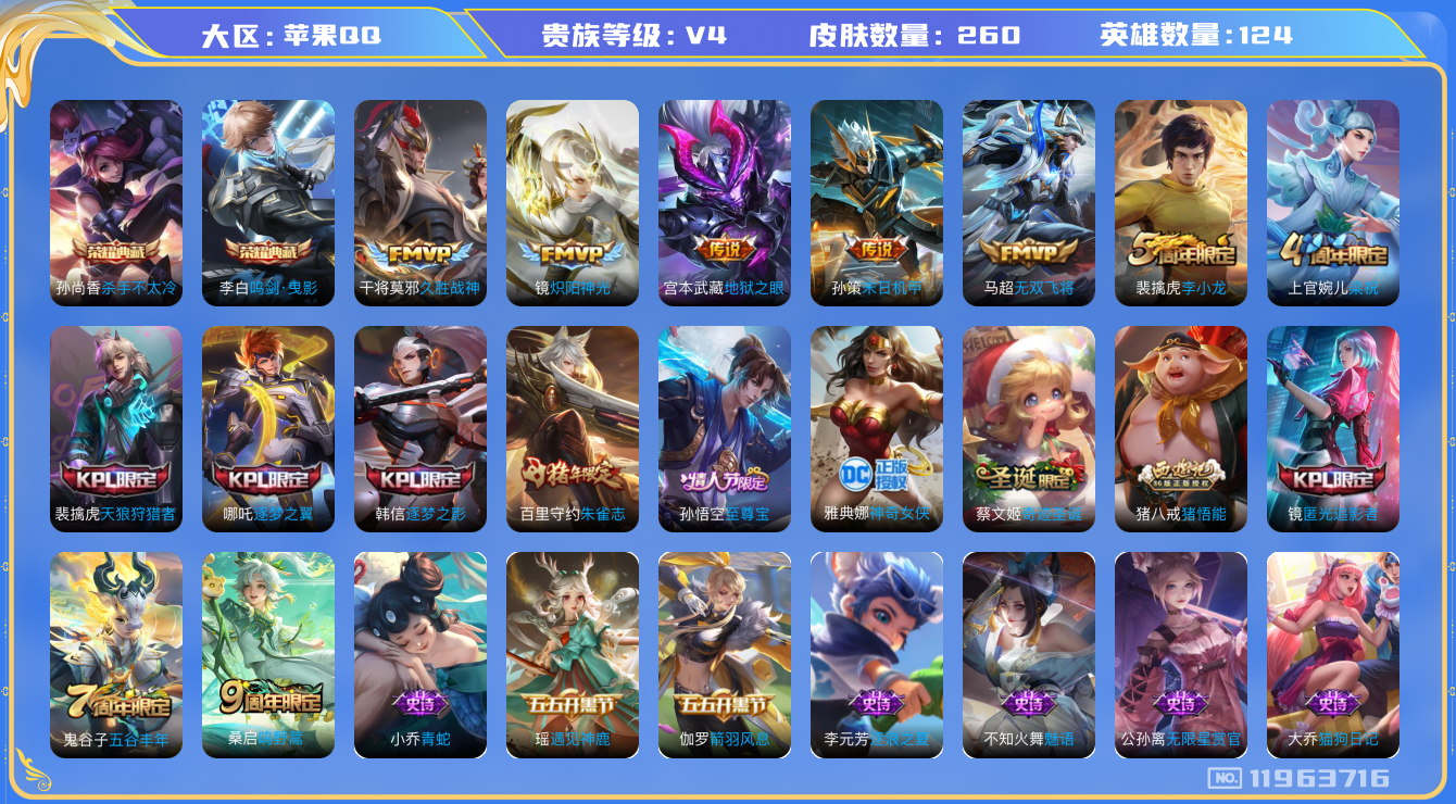 [11963716]【商品标题】:苹果Q-V4-最强王者段位-124英雄-260皮肤-2典藏-0珍品无双-0无双-0珍品传说-7传说-72史诗
