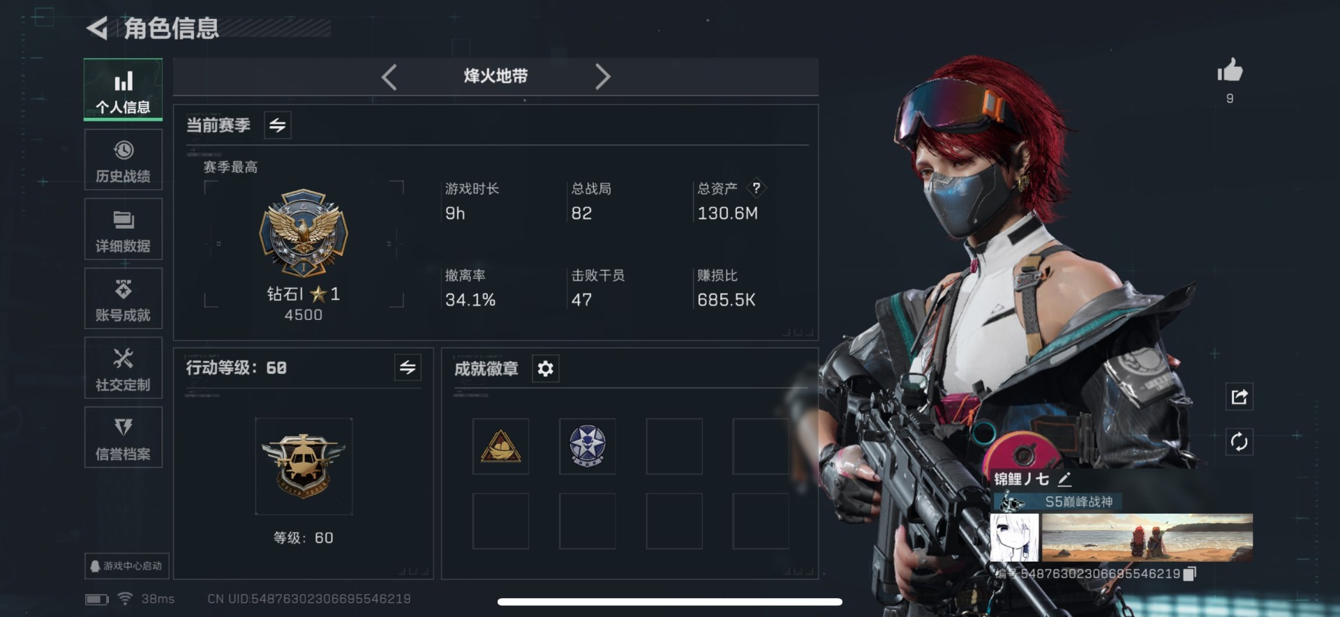 [11963723]总资产:130.6M 2干员外观 11传说枪械 哈夫币:191.303K 可二次 可修改实名 烽火地带段位:钻石 全面战场段位:无段位 传说武器皮肤:93R-捞点薯条,AK-12突击步枪-特斯拉线圈,SR-3M紧凑突击步枪-特斯拉线圈,UZI冲锋枪-特斯拉线圈,勇士冲锋枪-能天使-午夜邮差,Vector冲锋枪-能天使-午夜邮差,AWM狙击步枪-捞点薯条,腾龙突击步枪-捞点薯条,725双管霰弹枪-送葬人-无题密令,M4A1突击步枪-阿米娅,CAR-15突击步枪-阿米娅 史诗武器皮肤:PKM通用机枪-蝮蛇,AUG突击步枪-蝮蛇,SVD狙击步枪-荒野求生,SR-3M紧凑突击步枪-荒野求生,PSG-1射手步枪-无垢,MP7冲锋枪-无垢,腾龙突击步枪-无垢,SCAR-H战斗步枪-囚徒,SV-98狙击步枪-林中猎手,AS Val突击步枪-典狱官,M250通用机枪-囚徒,PKM通用机枪-荒野求生,P90冲锋枪-紧急戒备,PTR-32突击步枪-Old Habits,QJB201轻机枪-Old Habits,M16A4突击步枪-竞赛选手,QBZ95-1突击步枪-曙光 干员外观:蛊-能天使·午夜邮差,蜂医-送葬人·无题密令(S5)