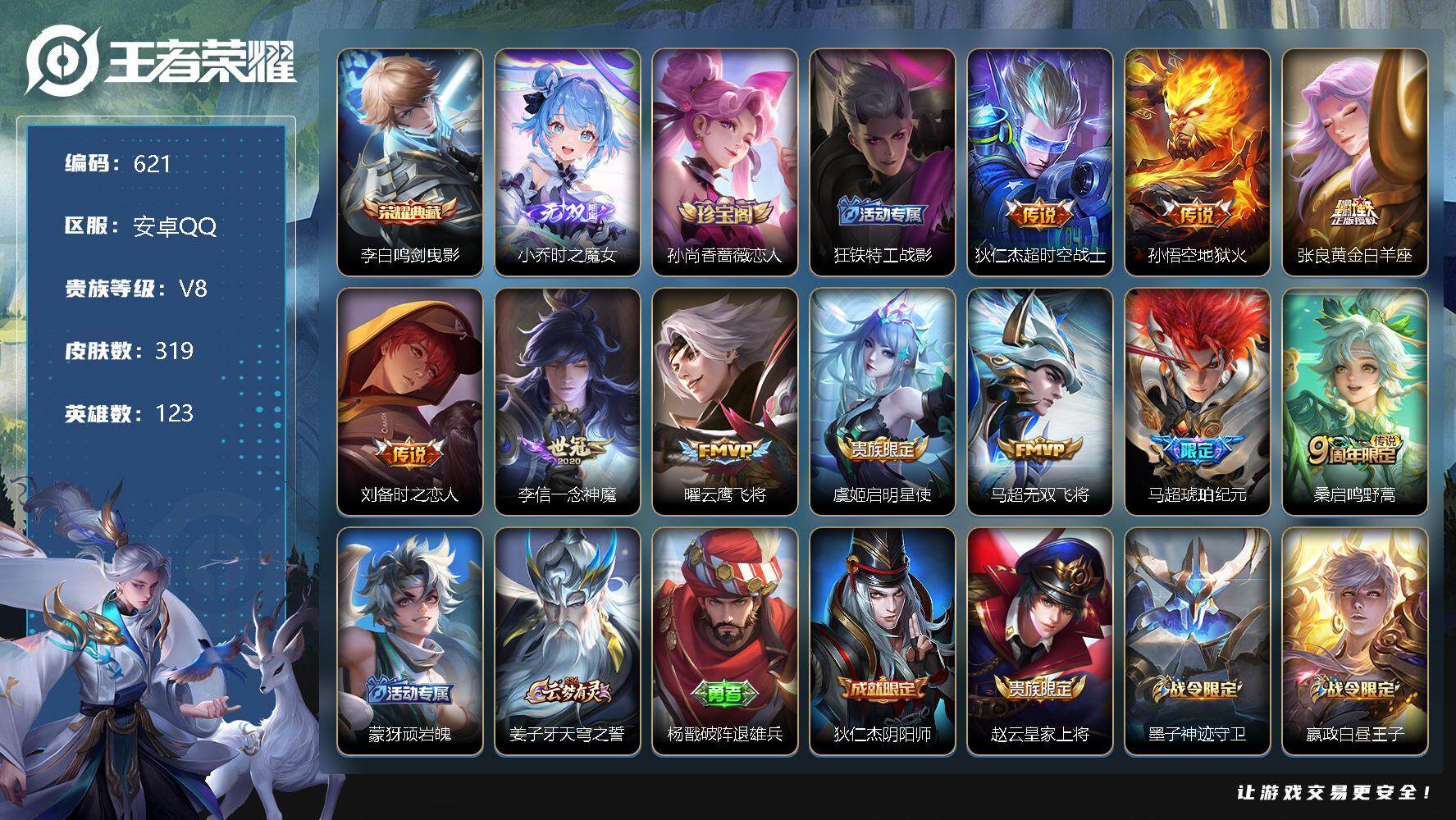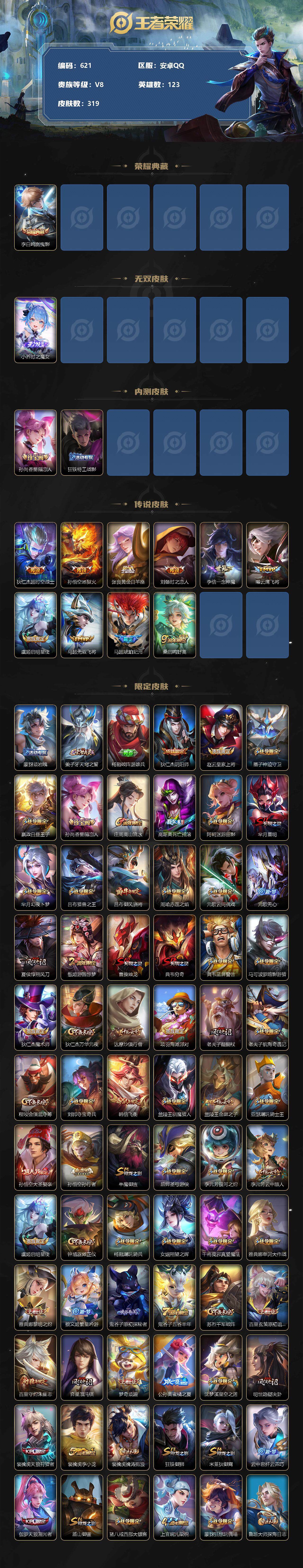 [11964523]【商品标题】:安卓Q-V8-至尊星耀III段位-123英雄-319皮肤-1典藏-0珍品无双-1无双-0珍品传说-10传说-96史诗