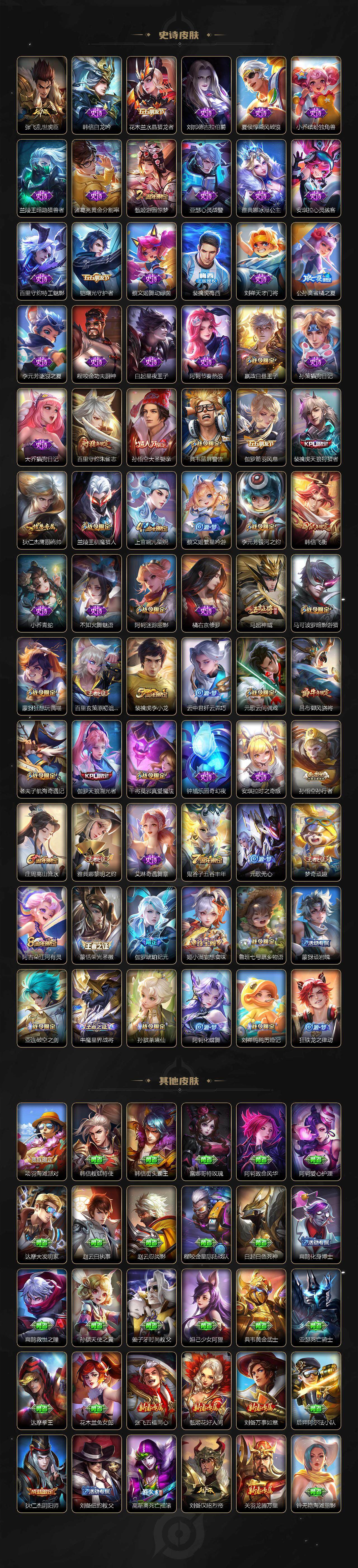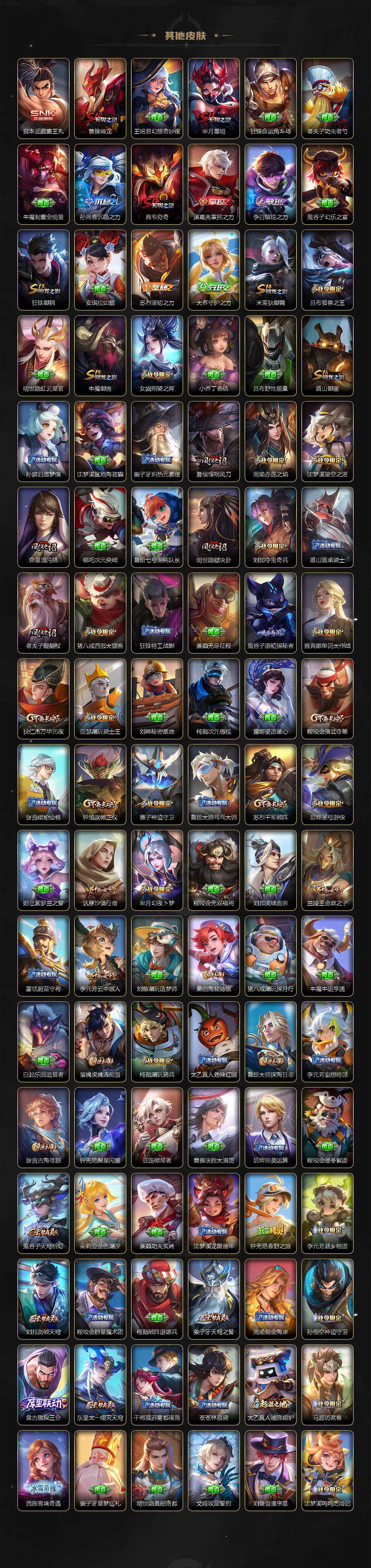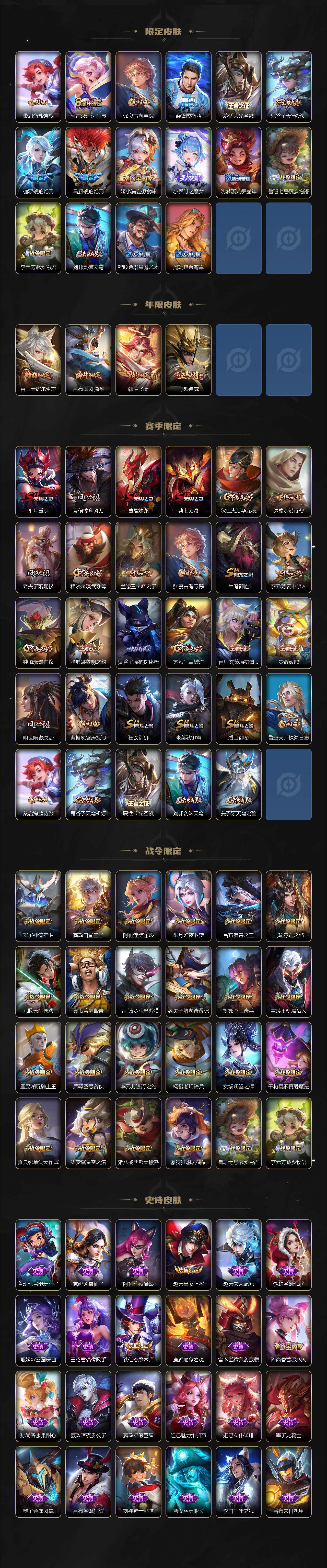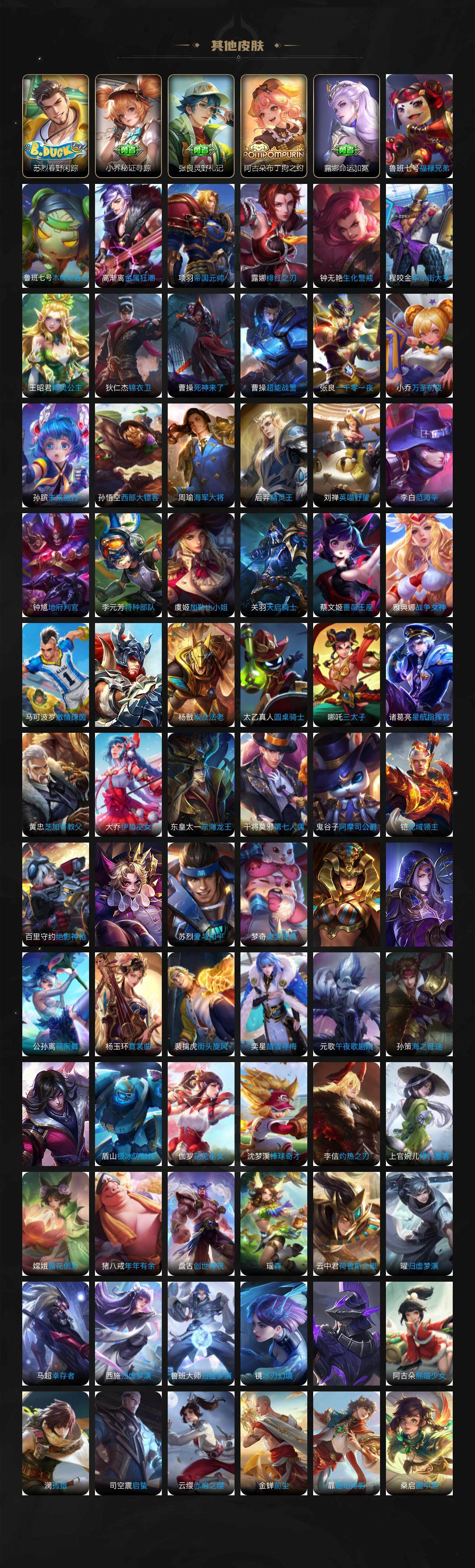 【限定皮肤】:蒙犽顽岩魄,姜子牙天穹之誓,杨戬破阵退雄兵,狄仁杰阴阳师,赵云皇家上将,墨子神迹守卫,嬴政白昼王子,孙尚香蔷薇恋人,庄周高山流水,高渐离死亡摇滚,阿轲迷踪丽影,芈月重明,芈月幻夜卜梦,吕布猎兽之王,吕布御风骁将,周瑜赤莲之焰,元歌云间偶戏,元歌无心,夏侯惇朔风刀,甄姬游园惊梦,曹操烛龙,典韦穷奇,典韦蓝屏警告,马可波罗暗影游猎,狄仁杰魔术师,狄仁杰万华元夜,达摩沙漠行僧,项羽海滩派对,老夫子醍醐杖,老夫子航海奇遇记,程咬金演武夺筹,刘邦夺宝奇兵,韩信飞衡,兰陵王驯魔猎人,兰陵王金庭之子,亚瑟潮玩骑士王,孙悟空大圣娶亲,孙悟空孙行者,牛魔御旌,后羿圣弓游侠,李元芳银河之约,李元芳云中旅人,虞姬启明星使,钟馗驱傩正仪,杨戬潮玩骑兵,女娲朔望之晖,干将莫邪真爱魔法,雅典娜单词大作战,雅典娜黎明之约,蔡文姬繁星吟游,鬼谷子原初探秘者,鬼谷子五谷丰年,苏烈千军破阵,百里玄策原初追逐者,百里守约朱雀志,弈星混沌棋,梦奇顽趣,公孙离蜜橘之夏,沈梦溪星空之诺,明世隐疑决卦,裴擒虎天狼狩猎者,裴擒虎李小龙,裴擒虎擒涛扼浪,狂铁御狮,米莱狄御霄,云中君纤云弄巧,伽罗天狼溯光者,盾山御銮,猪八戒西部大镖客,上官婉儿梁祝,蒙犽狂想玩偶喵,鲁班大师探海日志,桑启海盐诗旅,阿古朵江河有灵,张良古海寻踪,裴擒虎梅西,蒙恬荣光圣徽,鬼谷子天穹祈灯,伽罗琥珀纪元,马超琥珀纪元,姬小满妄想食味,小乔时之魔女,沈梦溪龙舞盛年,鲁班七号蔬乡物语,李元芳蔬乡物语,刘邦剑破天穹,程咬金群星魔术团,周瑜熔金海岸