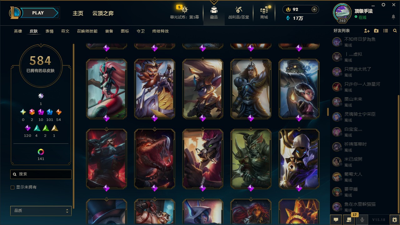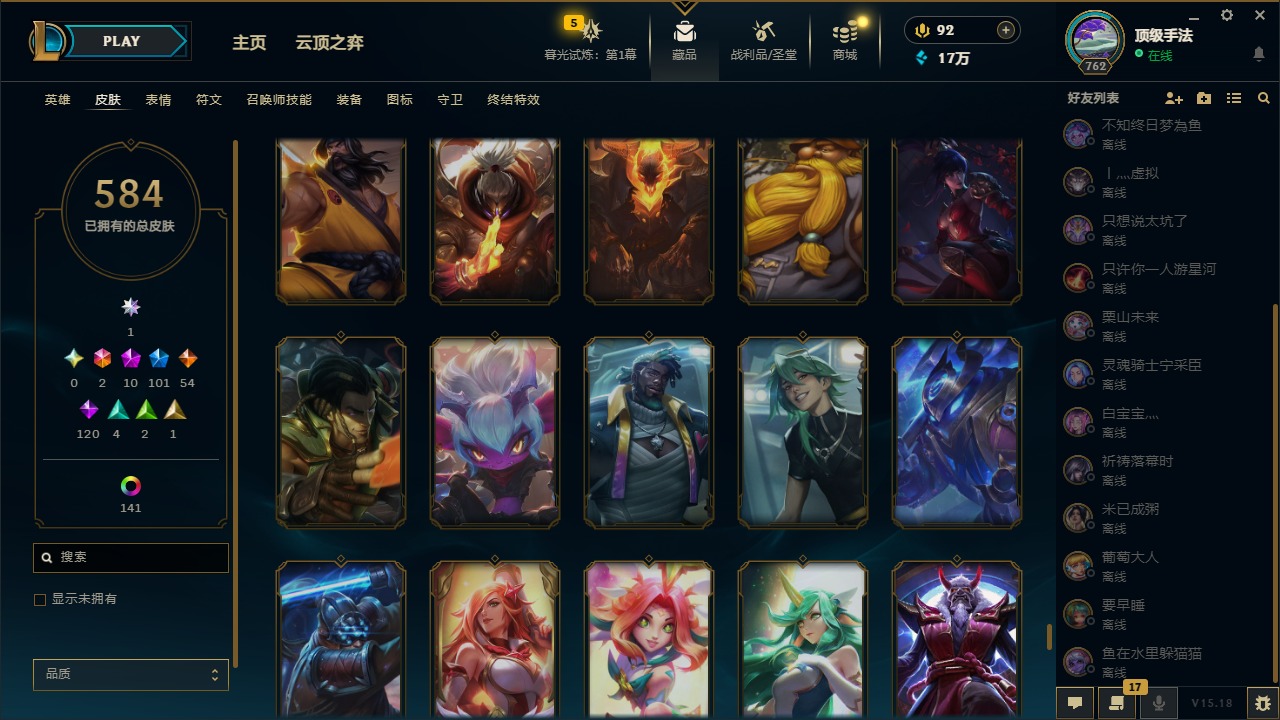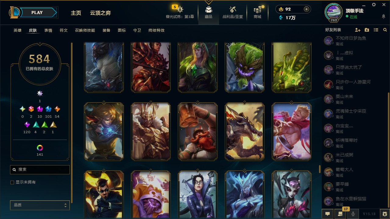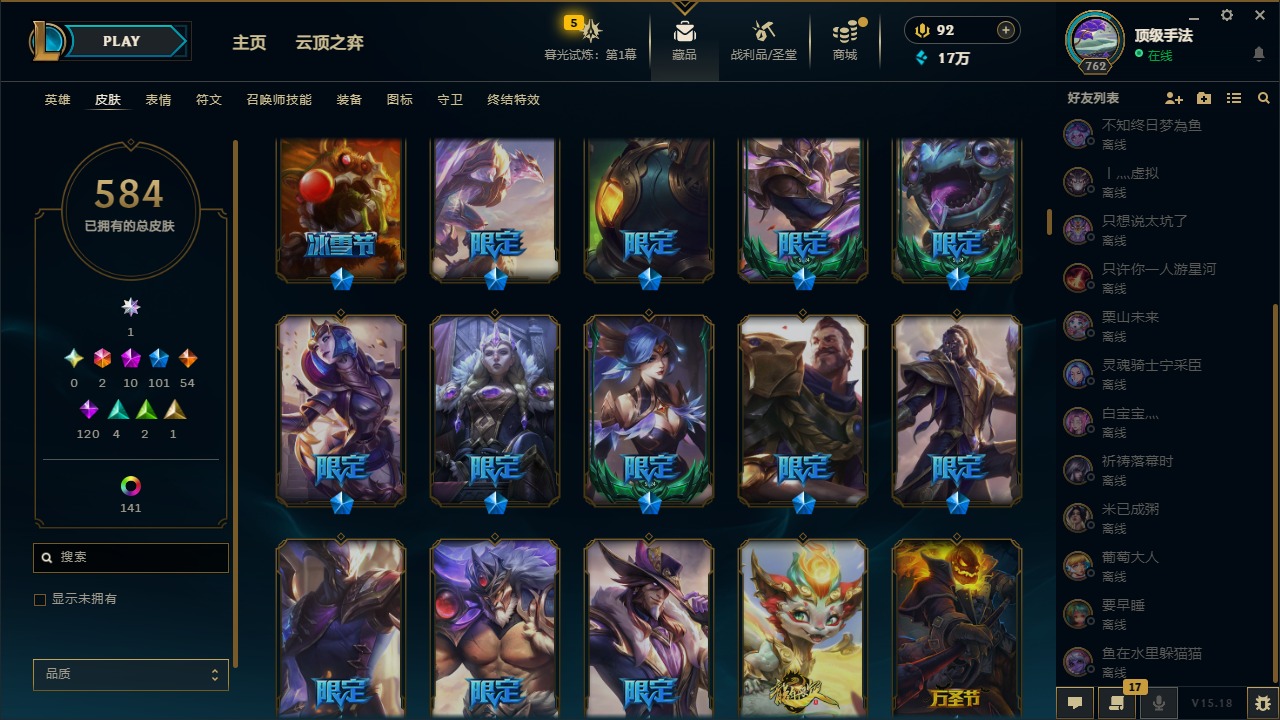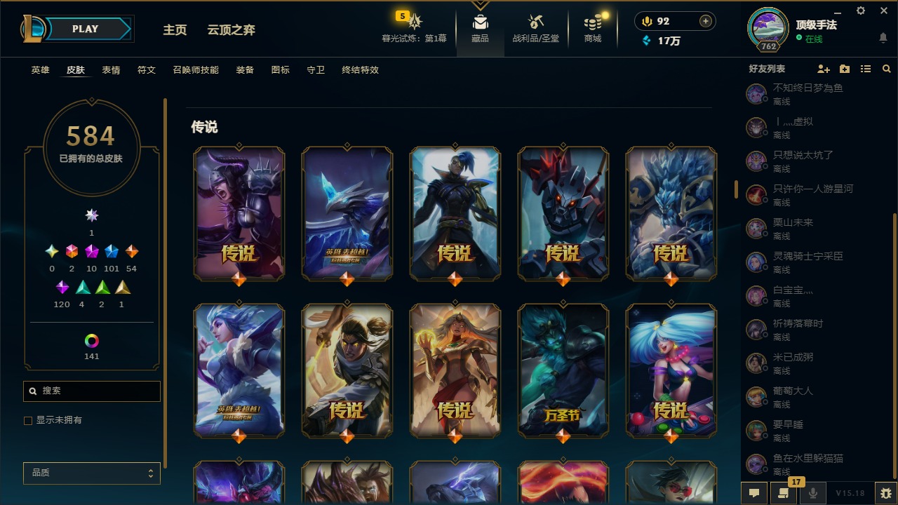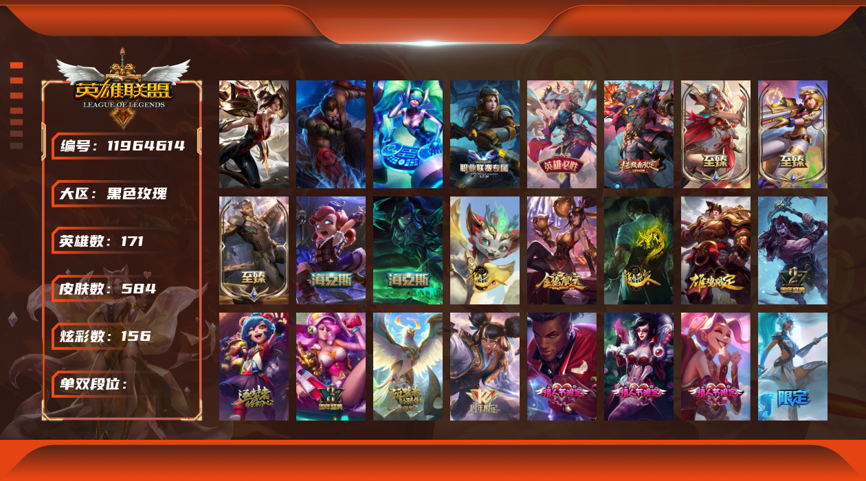 [11964614]2终极 10神话 101限定 54传说 120史诗 584皮肤 156炫彩 171英雄 可二次 可修改实名 优质装备:至臻 电玩女神 凯特琳,至臻 原计划:逆流 塞拉斯,源代码 乐芙兰,防爆天使 凯尔,巧克力工坊 波比,地底世界 崔斯特,电玩战魂 人马,都铎王朝 图奇,防爆机器人 布里茨,防爆士兵 炼金,防爆士兵 格雷福斯,冠军之箭 艾希,冠军之矛 滑板鞋,冠军之刃 锐雯 2016,冠军之血 希瓦娜,红桃杰克 崔斯特,克格汪 克格莫,蒙多蒙多,密林猎手 提莫,野兽猎人 德莱文,野兽猎人 瑟庄妮,野兽猎人 泰达米尔,勇者 阿狸,征服者 韦鲁斯,至臻 神凰行者 烈羽焰凰 霞,灵魂守卫,DJ-娑娜,玉剑传说 无影 竞星,冠军之刃 锐雯 2016 凯旋圣装,霸天异形 卡兹克 掠空魅影,无畏骑士 瑟庄妮 赤子初心,咖啡甜心 金克丝 核桃巴菲,净雪之月 莫甘娜 冬虹,墨之影武者 亚索 金墨耀影,十五周年纪念 希维尔,心之钢 伊泽瑞尔 天纵才华,魔女 阿卡丽 虚荣,殿堂传奇 卡莎,殿堂传奇 薇恩,暗裔英雄 盖伦,殿堂传奇 薇恩 登神 海克斯:摄魂 薇恩,海克斯 安妮 限定:斗魂觉醒 佛耶戈,玉剑传说 翼剑仙,钢铁军团 拉克丝 情人节限定:觅心猎手 薇恩,觅心萝莉 金克丝,觅心游侠 卢锡安 赛季限定皮:胜利凤凰 艾尼维亚,胜利之运 崔斯特,胜利剑圣 易,胜利女神 娑娜,胜利巨口 克格莫,胜利之王 泰达米尔,胜利枪神 格雷福斯,胜利女神 奥利安娜,胜利之剑 剑魔,胜利枪神 卢锡安,胜利机器人 布里茨,胜利女神 瑟庄妮 冠军限定系列:S13 T1 李青,S1FNC 酒桶,S2 暗杀星 努努,S2 暗杀星 慎,S3 SKT T1 薇恩,S3 SKT T1 李青,S4 SSW 图奇,S4 SSW 炼金,S5 SKT T1 瑞兹,S5 SKT T1 滑板鞋,S5 SKT T1 蜘蛛,S6 SKT T1 奥拉夫,S6 SKT T1 烬,S6 SKT T1 艾克,S6 SKT T1 球女,S6 SKT T1 扎克,S6 SKT T1 娜美,S8 IG 卡莎,S9 FPX 薇恩,S10 DWG 蕾欧娜,S10 DWG 奈德丽,S11 EDG 格雷福斯,S11 EDG 佐伊,S12 DRX 凯特琳 冰雪节限定:“主人不要我了” 阿木木,冰雪风暴 希维尔,冰雪节 格雷福斯,冰雪节 炼金,冰雪兽 纳尔