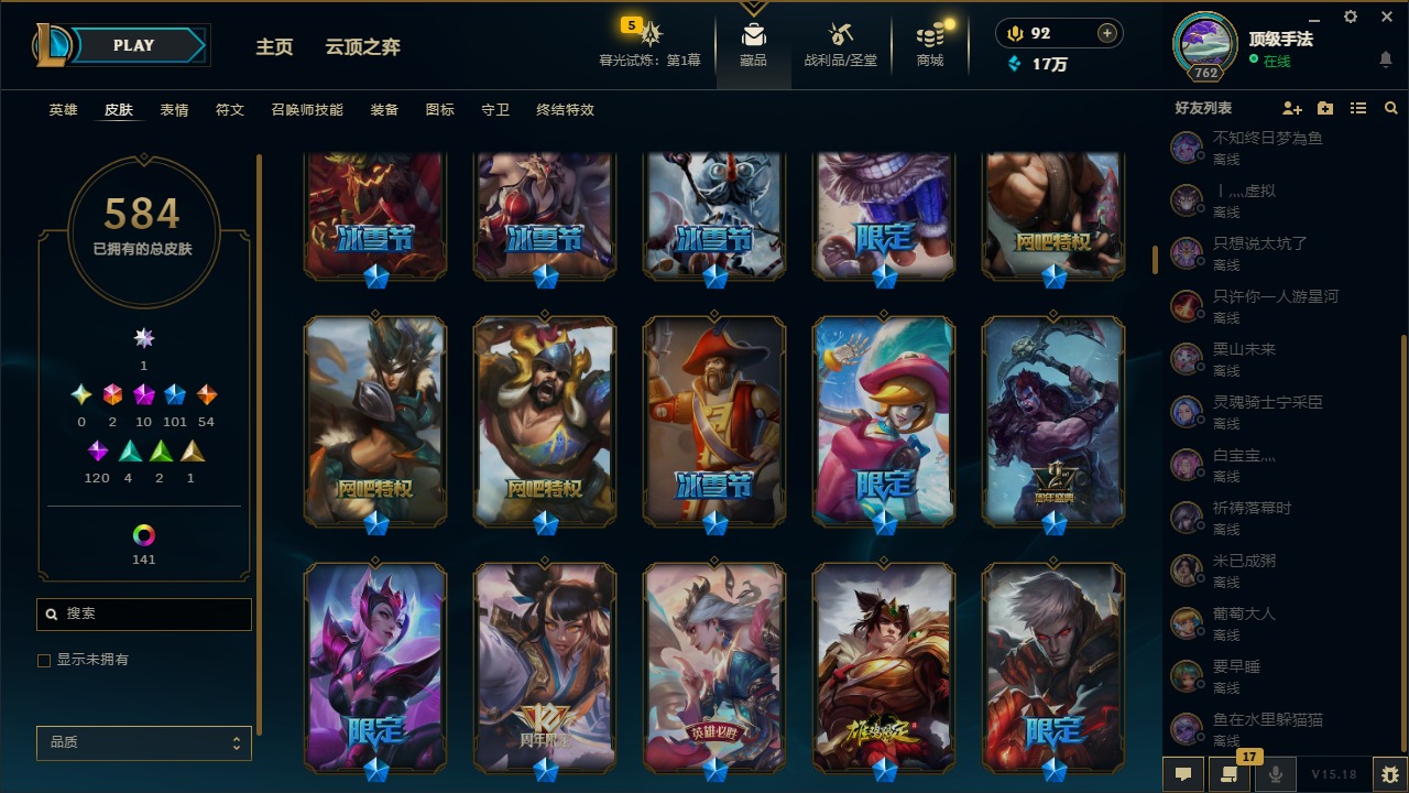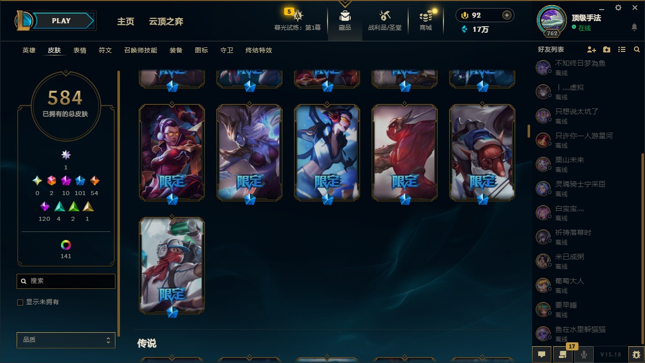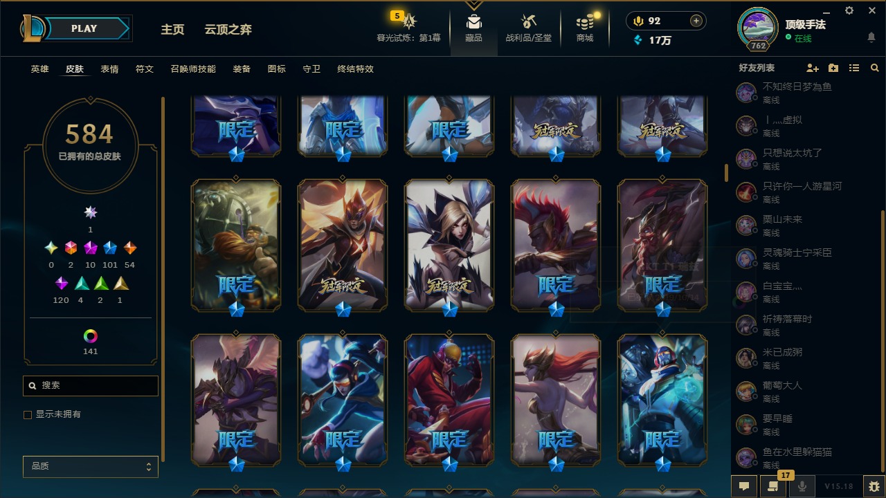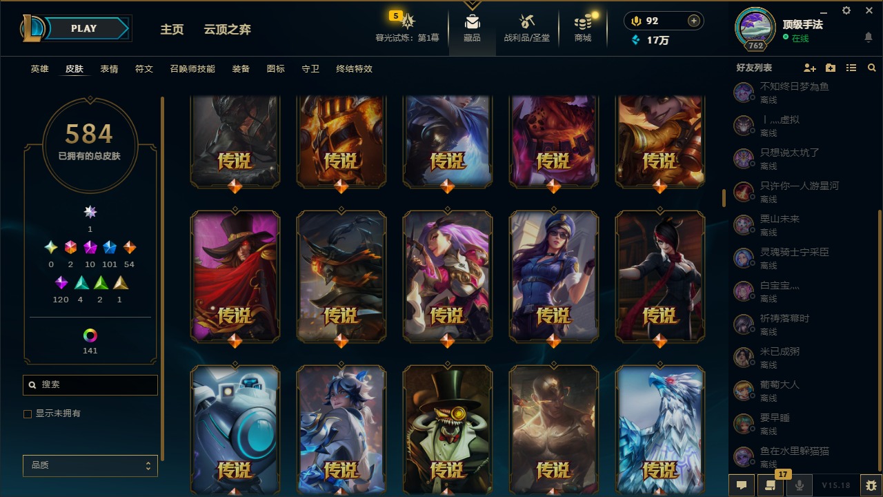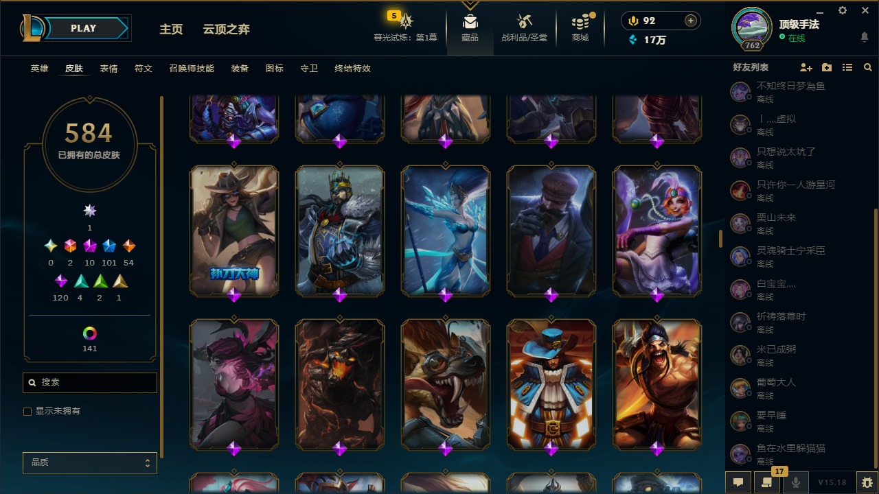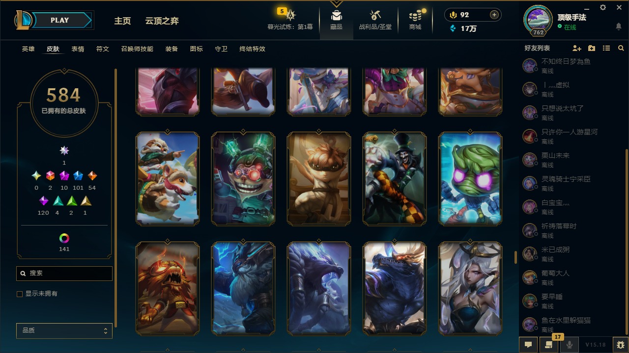 [11964614]2终极 10神话 101限定 54传说 120史诗 584皮肤 156炫彩 171英雄 可二次 可修改实名 优质装备:至臻 电玩女神 凯特琳,至臻 原计划:逆流 塞拉斯,源代码 乐芙兰,防爆天使 凯尔,巧克力工坊 波比,地底世界 崔斯特,电玩战魂 人马,都铎王朝 图奇,防爆机器人 布里茨,防爆士兵 炼金,防爆士兵 格雷福斯,冠军之箭 艾希,冠军之矛 滑板鞋,冠军之刃 锐雯 2016,冠军之血 希瓦娜,红桃杰克 崔斯特,克格汪 克格莫,蒙多蒙多,密林猎手 提莫,野兽猎人 德莱文,野兽猎人 瑟庄妮,野兽猎人 泰达米尔,勇者 阿狸,征服者 韦鲁斯,至臻 神凰行者 烈羽焰凰 霞,灵魂守卫,DJ-娑娜,玉剑传说 无影 竞星,冠军之刃 锐雯 2016 凯旋圣装,霸天异形 卡兹克 掠空魅影,无畏骑士 瑟庄妮 赤子初心,咖啡甜心 金克丝 核桃巴菲,净雪之月 莫甘娜 冬虹,墨之影武者 亚索 金墨耀影,十五周年纪念 希维尔,心之钢 伊泽瑞尔 天纵才华,魔女 阿卡丽 虚荣,殿堂传奇 卡莎,殿堂传奇 薇恩,暗裔英雄 盖伦,殿堂传奇 薇恩 登神 海克斯:摄魂 薇恩,海克斯 安妮 限定:斗魂觉醒 佛耶戈,玉剑传说 翼剑仙,钢铁军团 拉克丝 情人节限定:觅心猎手 薇恩,觅心萝莉 金克丝,觅心游侠 卢锡安 赛季限定皮:胜利凤凰 艾尼维亚,胜利之运 崔斯特,胜利剑圣 易,胜利女神 娑娜,胜利巨口 克格莫,胜利之王 泰达米尔,胜利枪神 格雷福斯,胜利女神 奥利安娜,胜利之剑 剑魔,胜利枪神 卢锡安,胜利机器人 布里茨,胜利女神 瑟庄妮 冠军限定系列:S13 T1 李青,S1FNC 酒桶,S2 暗杀星 努努,S2 暗杀星 慎,S3 SKT T1 薇恩,S3 SKT T1 李青,S4 SSW 图奇,S4 SSW 炼金,S5 SKT T1 瑞兹,S5 SKT T1 滑板鞋,S5 SKT T1 蜘蛛,S6 SKT T1 奥拉夫,S6 SKT T1 烬,S6 SKT T1 艾克,S6 SKT T1 球女,S6 SKT T1 扎克,S6 SKT T1 娜美,S8 IG 卡莎,S9 FPX 薇恩,S10 DWG 蕾欧娜,S10 DWG 奈德丽,S11 EDG 格雷福斯,S11 EDG 佐伊,S12 DRX 凯特琳 冰雪节限定:“主人不要我了” 阿木木,冰雪风暴 希维尔,冰雪节 格雷福斯,冰雪节 炼金,冰雪兽 纳尔