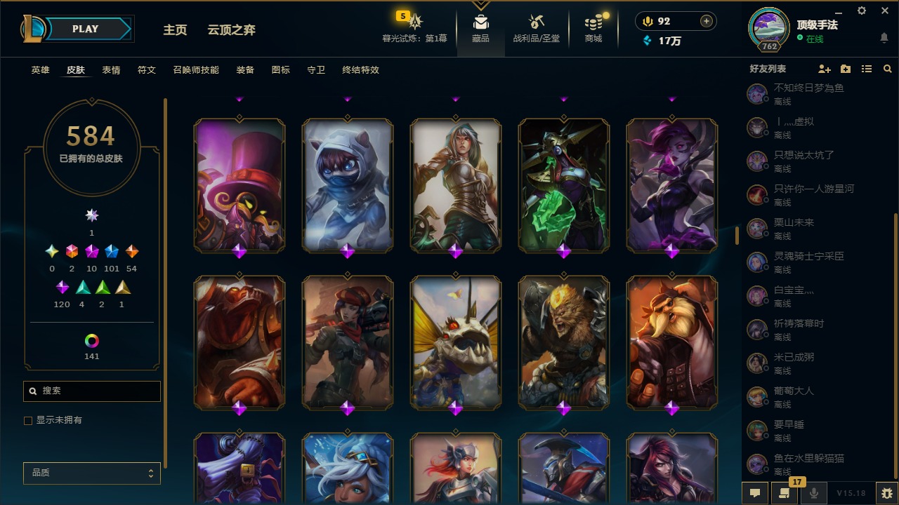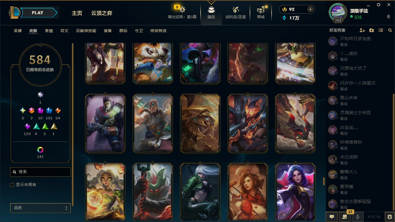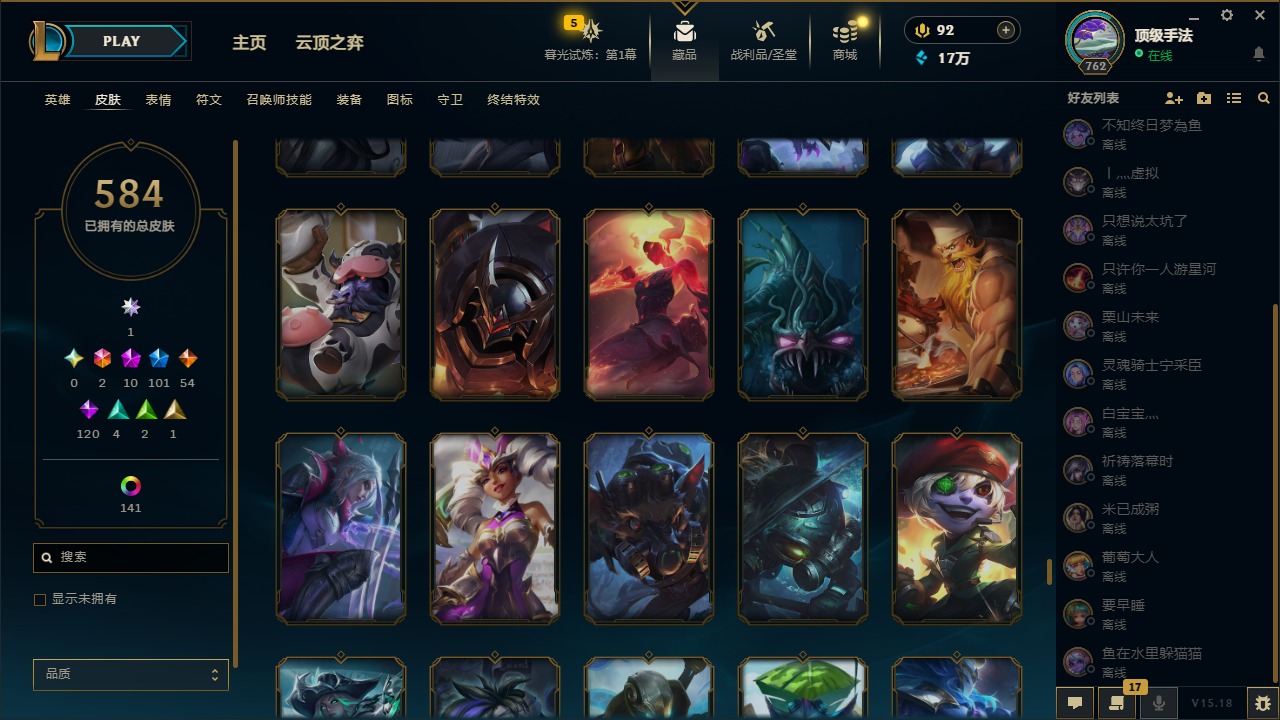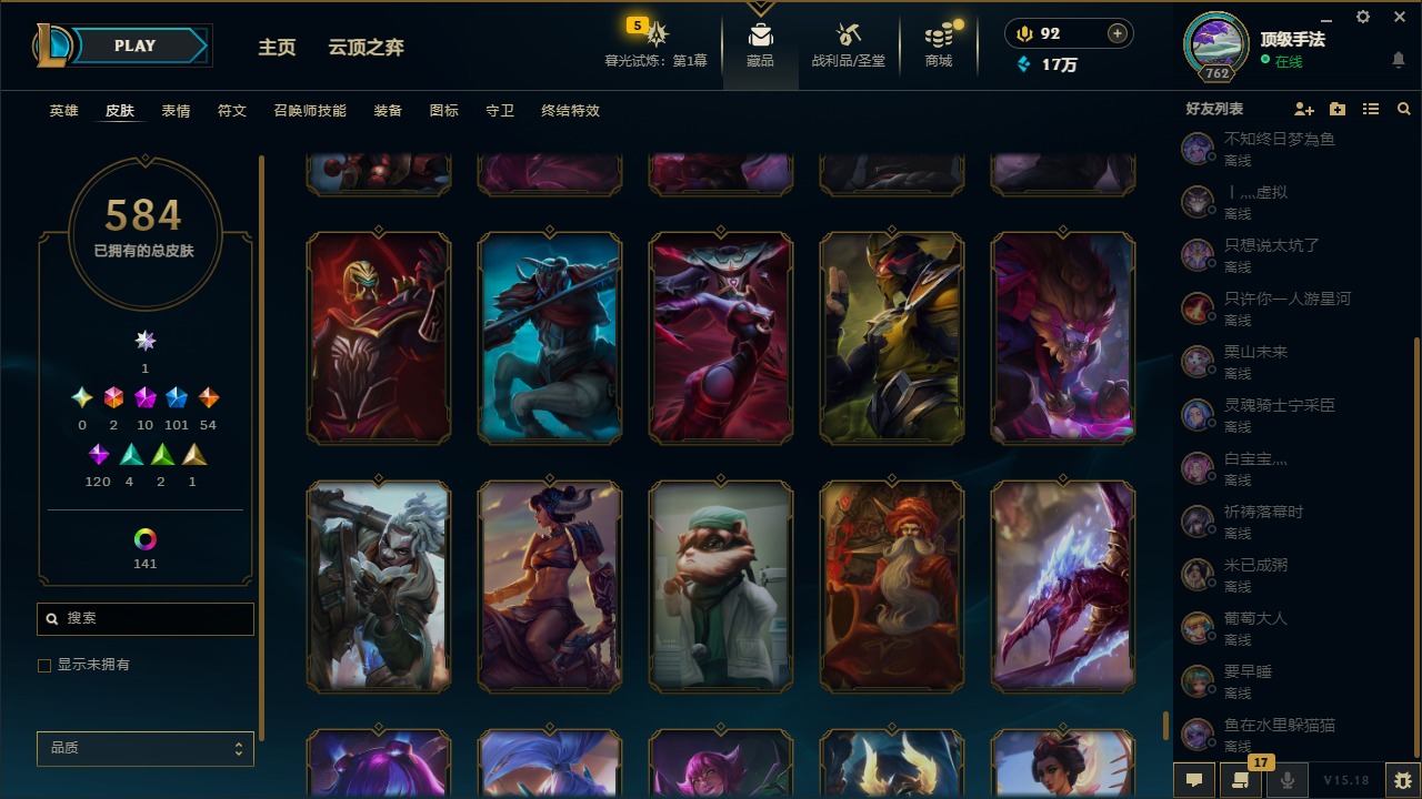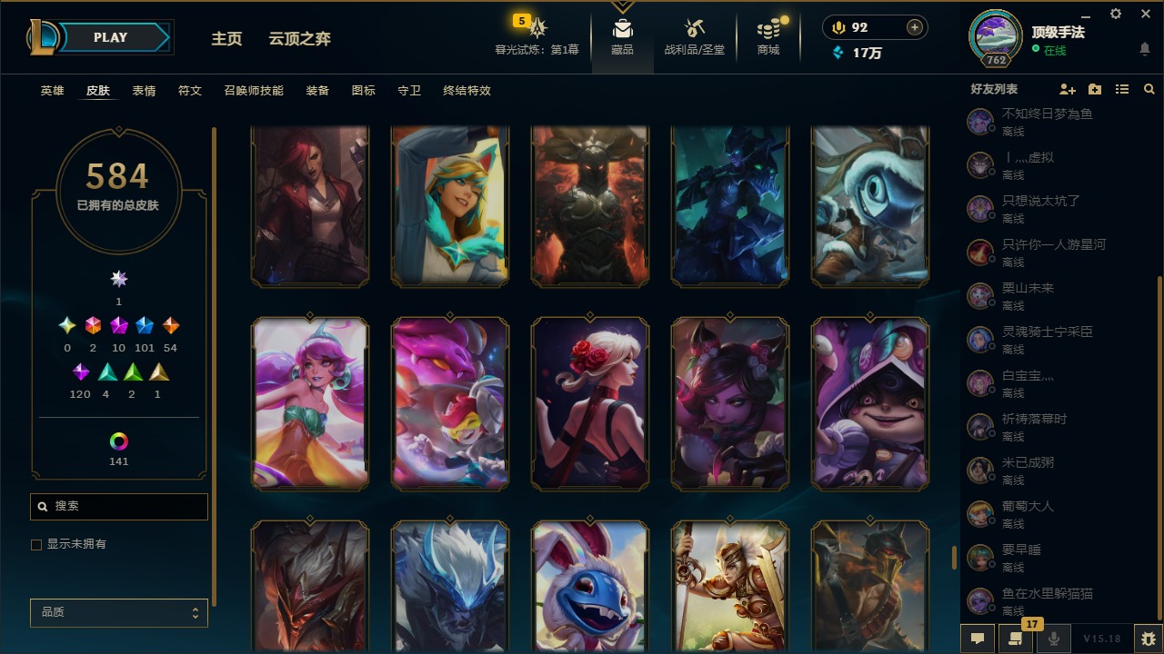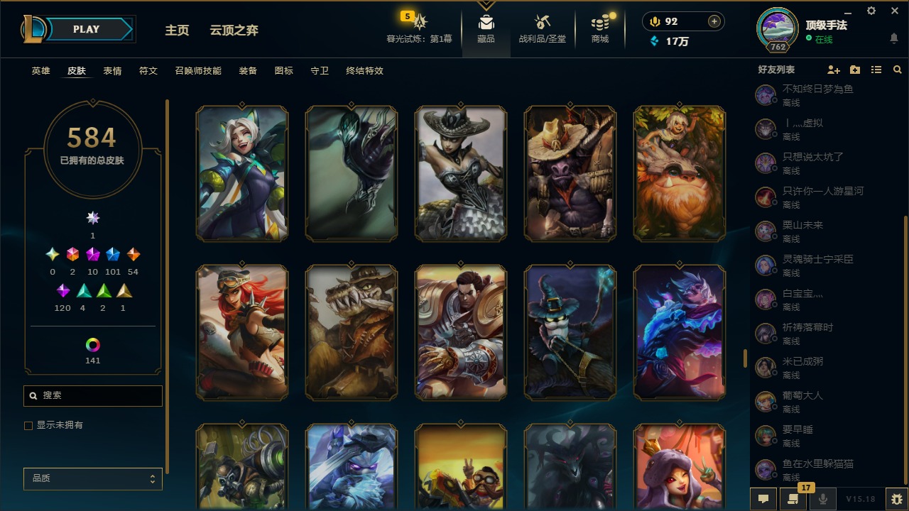 [11964614]2终极 10神话 101限定 54传说 120史诗 584皮肤 156炫彩 171英雄 可二次 可修改实名 优质装备:至臻 电玩女神 凯特琳,至臻 原计划:逆流 塞拉斯,源代码 乐芙兰,防爆天使 凯尔,巧克力工坊 波比,地底世界 崔斯特,电玩战魂 人马,都铎王朝 图奇,防爆机器人 布里茨,防爆士兵 炼金,防爆士兵 格雷福斯,冠军之箭 艾希,冠军之矛 滑板鞋,冠军之刃 锐雯 2016,冠军之血 希瓦娜,红桃杰克 崔斯特,克格汪 克格莫,蒙多蒙多,密林猎手 提莫,野兽猎人 德莱文,野兽猎人 瑟庄妮,野兽猎人 泰达米尔,勇者 阿狸,征服者 韦鲁斯,至臻 神凰行者 烈羽焰凰 霞,灵魂守卫,DJ-娑娜,玉剑传说 无影 竞星,冠军之刃 锐雯 2016 凯旋圣装,霸天异形 卡兹克 掠空魅影,无畏骑士 瑟庄妮 赤子初心,咖啡甜心 金克丝 核桃巴菲,净雪之月 莫甘娜 冬虹,墨之影武者 亚索 金墨耀影,十五周年纪念 希维尔,心之钢 伊泽瑞尔 天纵才华,魔女 阿卡丽 虚荣,殿堂传奇 卡莎,殿堂传奇 薇恩,暗裔英雄 盖伦,殿堂传奇 薇恩 登神 海克斯:摄魂 薇恩,海克斯 安妮 限定:斗魂觉醒 佛耶戈,玉剑传说 翼剑仙,钢铁军团 拉克丝 情人节限定:觅心猎手 薇恩,觅心萝莉 金克丝,觅心游侠 卢锡安 赛季限定皮:胜利凤凰 艾尼维亚,胜利之运 崔斯特,胜利剑圣 易,胜利女神 娑娜,胜利巨口 克格莫,胜利之王 泰达米尔,胜利枪神 格雷福斯,胜利女神 奥利安娜,胜利之剑 剑魔,胜利枪神 卢锡安,胜利机器人 布里茨,胜利女神 瑟庄妮 冠军限定系列:S13 T1 李青,S1FNC 酒桶,S2 暗杀星 努努,S2 暗杀星 慎,S3 SKT T1 薇恩,S3 SKT T1 李青,S4 SSW 图奇,S4 SSW 炼金,S5 SKT T1 瑞兹,S5 SKT T1 滑板鞋,S5 SKT T1 蜘蛛,S6 SKT T1 奥拉夫,S6 SKT T1 烬,S6 SKT T1 艾克,S6 SKT T1 球女,S6 SKT T1 扎克,S6 SKT T1 娜美,S8 IG 卡莎,S9 FPX 薇恩,S10 DWG 蕾欧娜,S10 DWG 奈德丽,S11 EDG 格雷福斯,S11 EDG 佐伊,S12 DRX 凯特琳 冰雪节限定:“主人不要我了” 阿木木,冰雪风暴 希维尔,冰雪节 格雷福斯,冰雪节 炼金,冰雪兽 纳尔