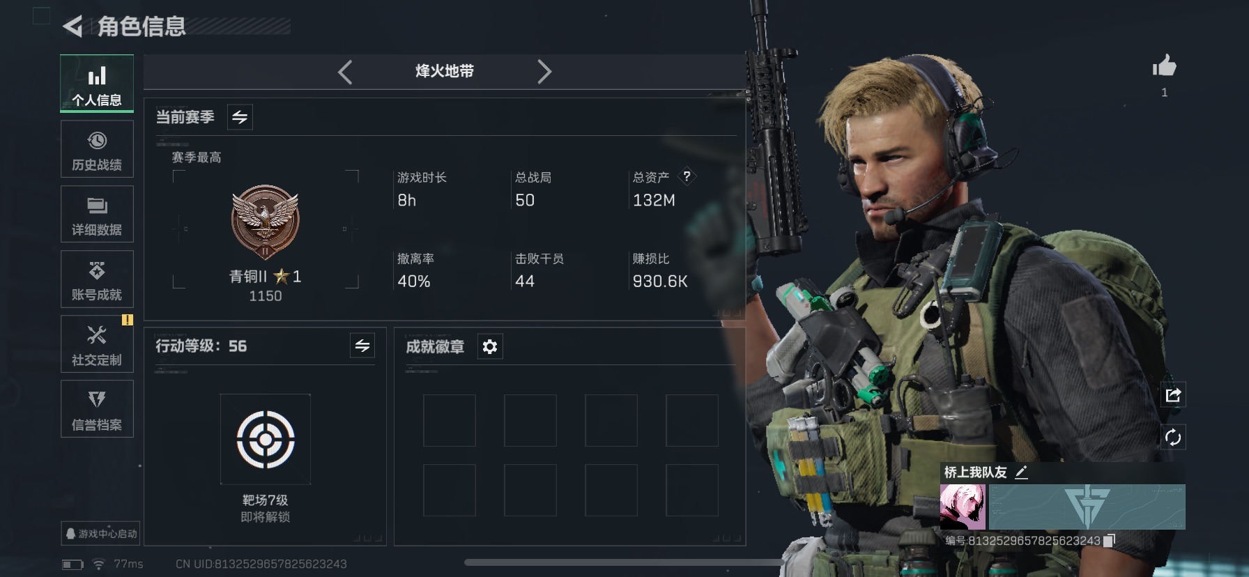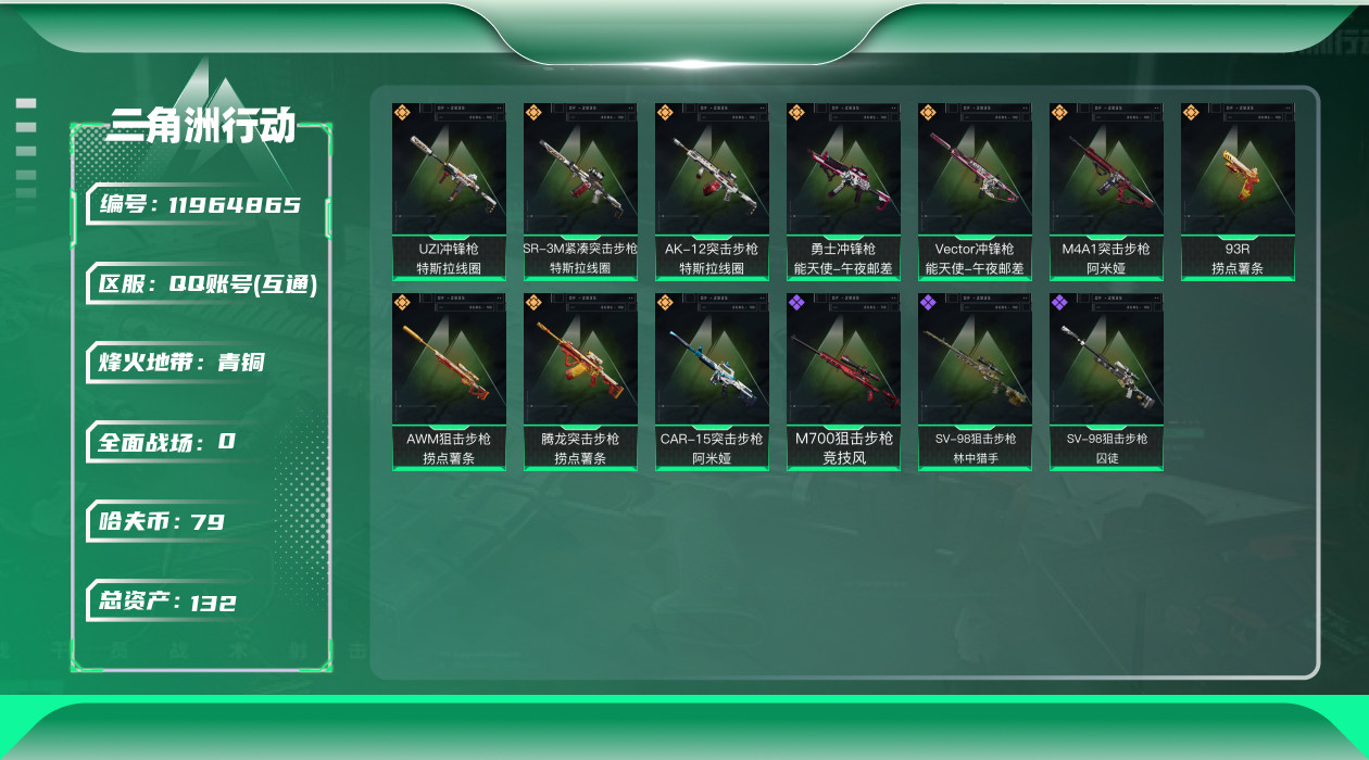 [11964865]总资产:132M 10传说枪械 哈夫币:79.543K 可二次 可修改实名 烽火地带段位:青铜 全面战场段位:无段位 传说武器皮肤:93R-捞点薯条,AK-12突击步枪-特斯拉线圈,SR-3M紧凑突击步枪-特斯拉线圈,UZI冲锋枪-特斯拉线圈,勇士冲锋枪-能天使-午夜邮差,Vector冲锋枪-能天使-午夜邮差,AWM狙击步枪-捞点薯条,腾龙突击步枪-捞点薯条,M4A1突击步枪-阿米娅,CAR-15突击步枪-阿米娅 史诗武器皮肤:SV-98狙击步枪-囚徒,SV-98狙击步枪-林中猎手,M700狙击步枪-竞技风