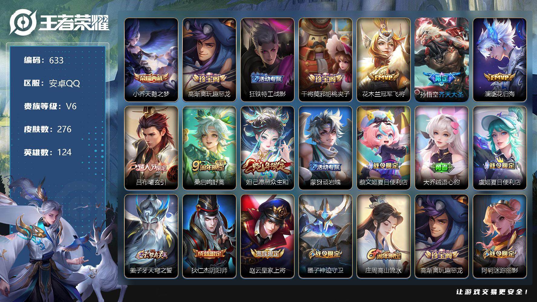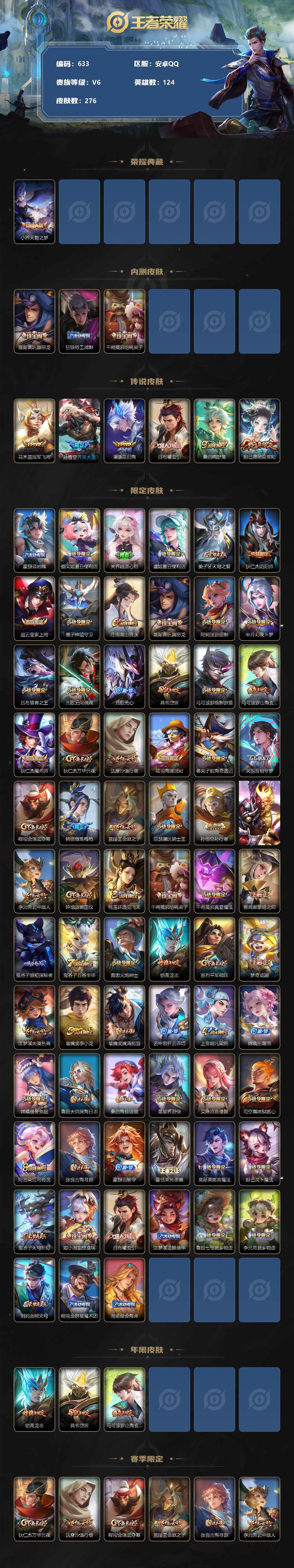 [11965329]【商品标题】:安卓Q-V6-至尊星耀II段位-124英雄-276皮肤-1典藏-0珍品无双-0无双-0珍品传说-6传说-79史诗