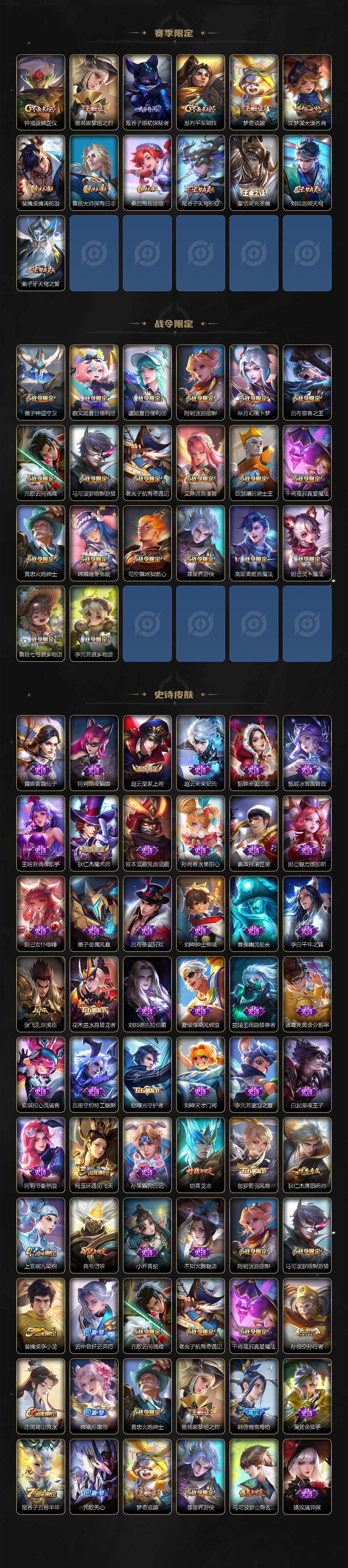 【赛季限定】:狄仁杰万华元夜,达摩沙漠行僧,程咬金演武夺筹,兰陵王金庭之子,张良古海寻踪,李元芳云中旅人,钟馗驱傩正仪,雅典娜黎明之约,鬼谷子原初探秘者,苏烈千军破阵,梦奇顽趣,沈梦溪大漠名商,裴擒虎擒涛扼浪,鲁班大师探海日志,桑启海盐诗旅,鬼谷子天穹祈灯,蒙恬荣光圣徽,刘邦剑破天穹,姜子牙天穹之誓