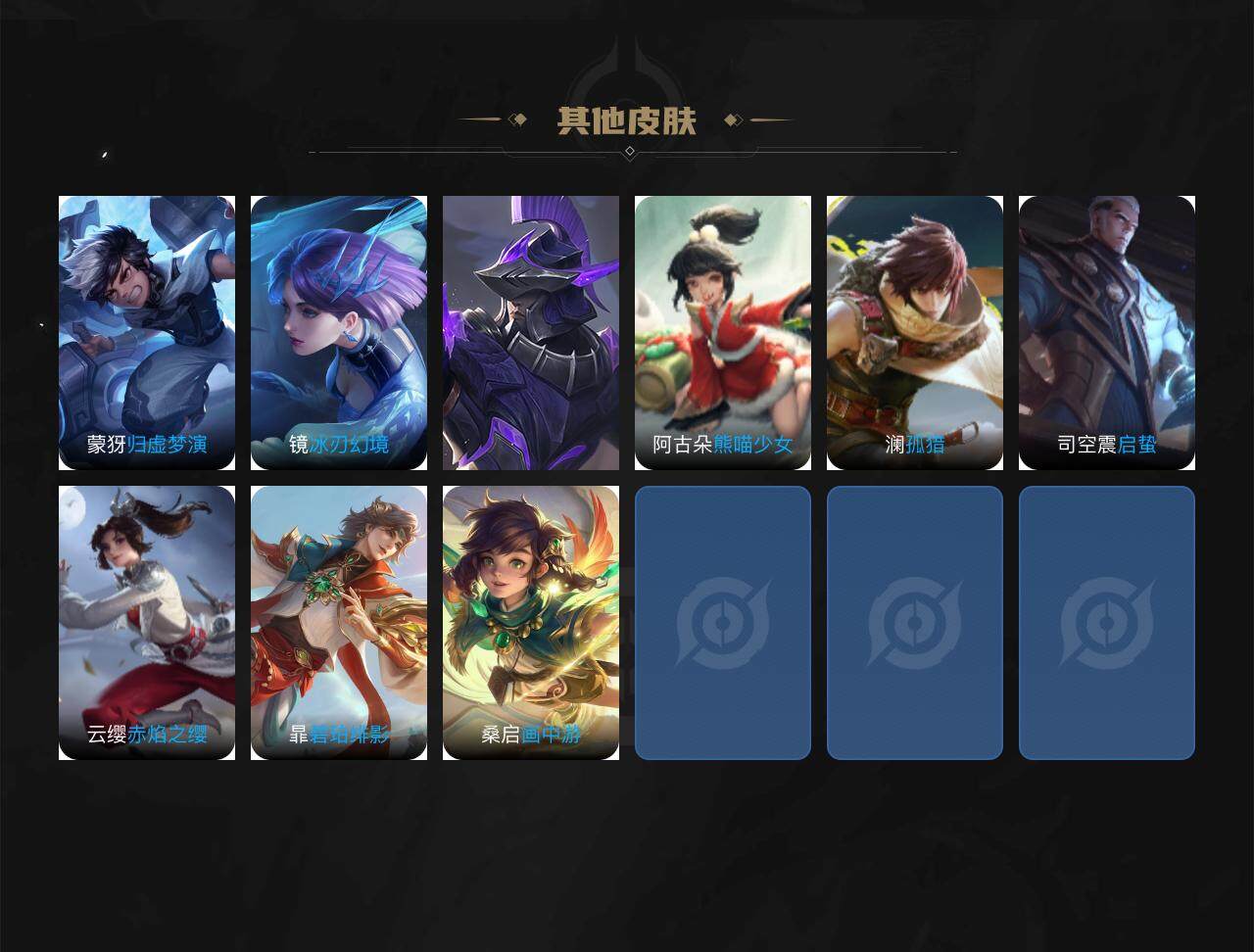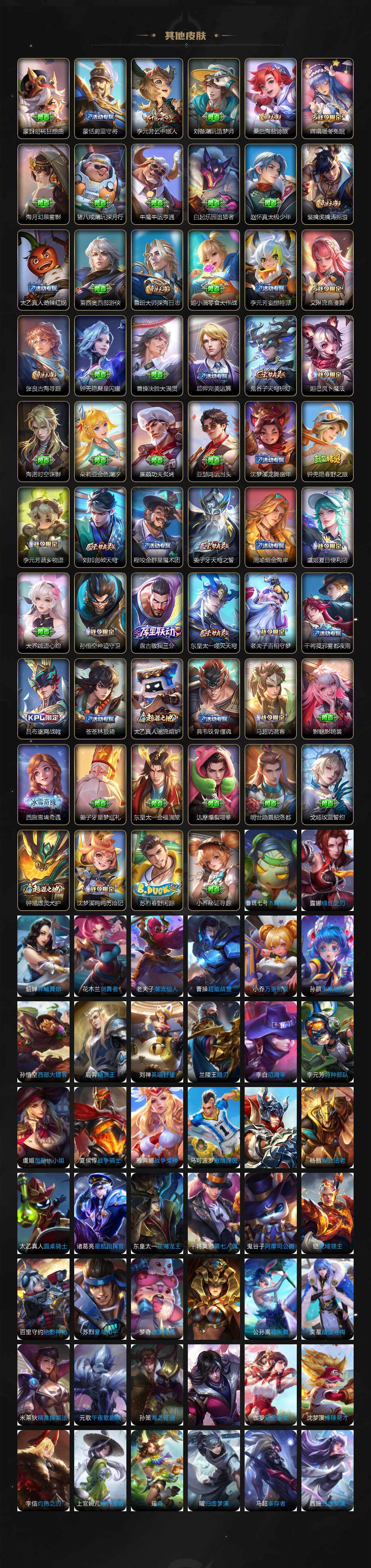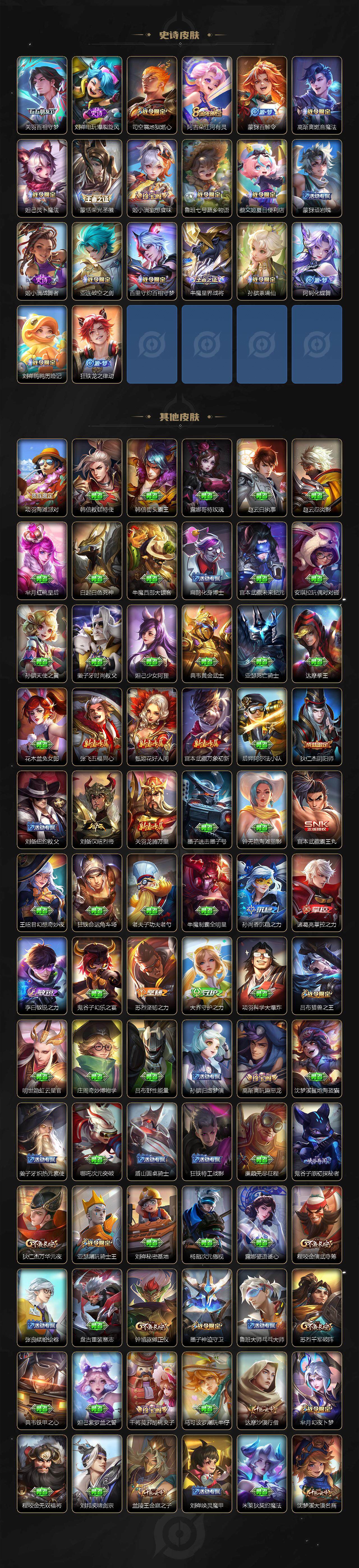 【限定皮肤】:蒙犽顽岩魄,蔡文姬夏日便利店,大乔绒语心约,虞姬夏日便利店,姜子牙天穹之誓,狄仁杰阴阳师,赵云皇家上将,墨子神迹守卫,庄周高山流水,高渐离玩趣恶龙,阿轲迷踪丽影,芈月幻夜卜梦,吕布猎兽之王,元歌云间偶戏,元歌无心,典韦岱宗,马可波罗暗影游猎,马可波罗山海玄木吟,狄仁杰魔术师,狄仁杰万华元夜,达摩沙漠行僧,项羽海滩派对,老夫子航海奇遇记,关羽百相守梦,程咬金演武夺筹,韩信傲雪梅枪,兰陵王金庭之子,亚瑟潮玩骑士王,孙悟空孙行者,孙悟空齐天大圣,李元芳云中旅人,钟馗驱傩正仪,杨玉环遇见飞天,干将莫邪胡桃夹子,干将莫邪真爱魔法,雅典娜黎明之约,鬼谷子原初探秘者,鬼谷子五谷丰年,黄忠火炮绅士,铠青龙志,苏烈千军破阵,梦奇顽趣,沈梦溪大漠名商,裴擒虎李小龙,裴擒虎擒涛扼浪,云中君纤云弄巧,上官婉儿梁祝,嫦娥拒霜思,嫦娥暖冬兔眠,鲁班大师探海日志,桑启海盐诗旅,暃星界游侠,艾琳流音漫舞,司空震地狱燃心,阿古朵江河有灵,张良古海寻踪,蒙犽百解令,蒙恬荣光圣徽,高渐离燃音魔法,妲己灵卜魔法,鬼谷子天穹祈灯,姬小满妄想食味,吕布曦玄引,沈梦溪龙舞盛年,鲁班七号蔬乡物语,李元芳蔬乡物语,刘邦剑破天穹,程咬金群星魔术团,周瑜熔金海岸
