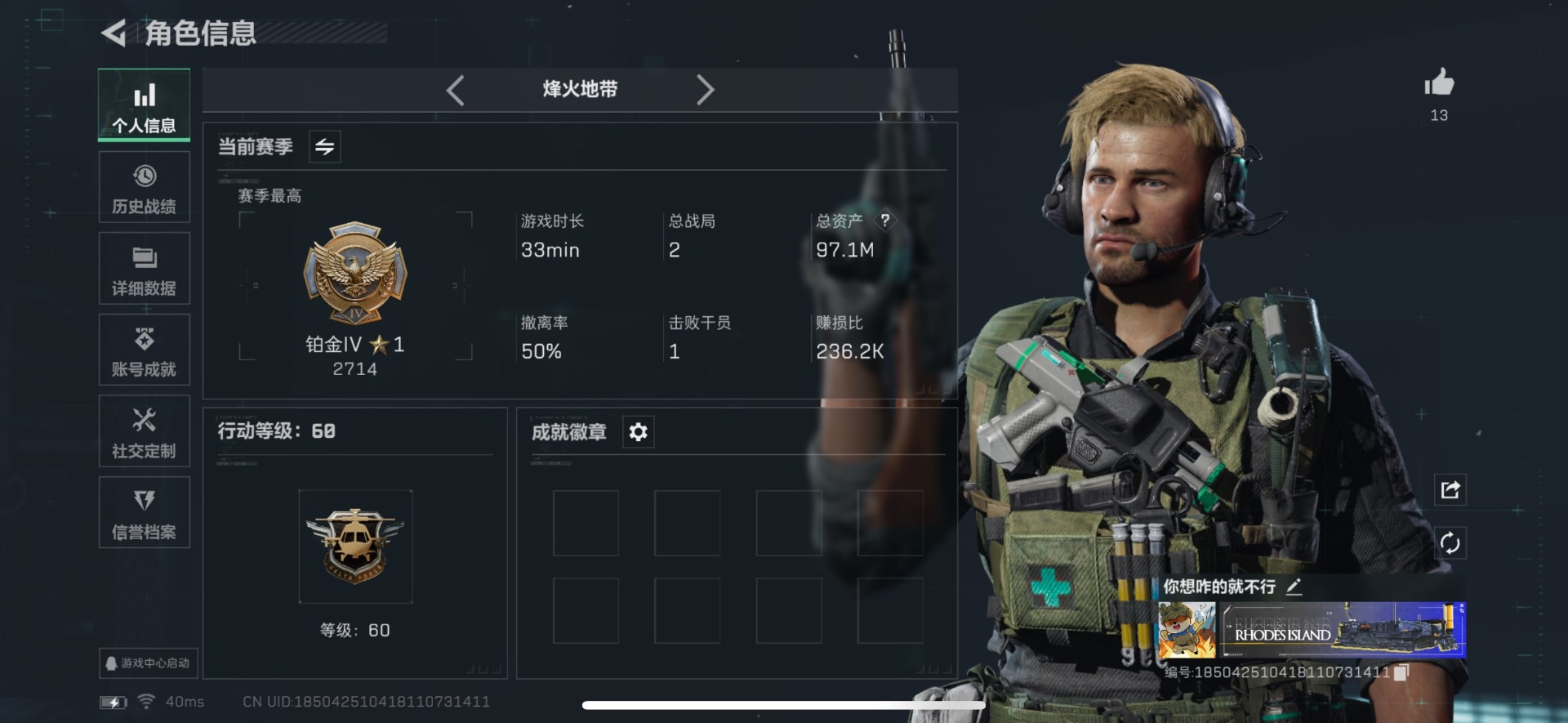 [11965529]总资产:97.1M 5传说枪械 哈夫币:74.173K 可二次 可修改实名 烽火地带段位:铂金 全面战场段位:上等兵 传说武器皮肤:Vector冲锋枪-能天使-午夜邮差,M16A4突击步枪-狩猎时刻,G3战斗步枪-狩猎时刻,CAR-15突击步枪-阿米娅,Vector冲锋枪-狩猎时刻 史诗武器皮肤:PKM通用机枪-蝮蛇,SV-98狙击步枪-林中猎手,P90冲锋枪-紧急戒备,QJB201轻机枪-Old Habits,M16A4突击步枪-竞赛选手