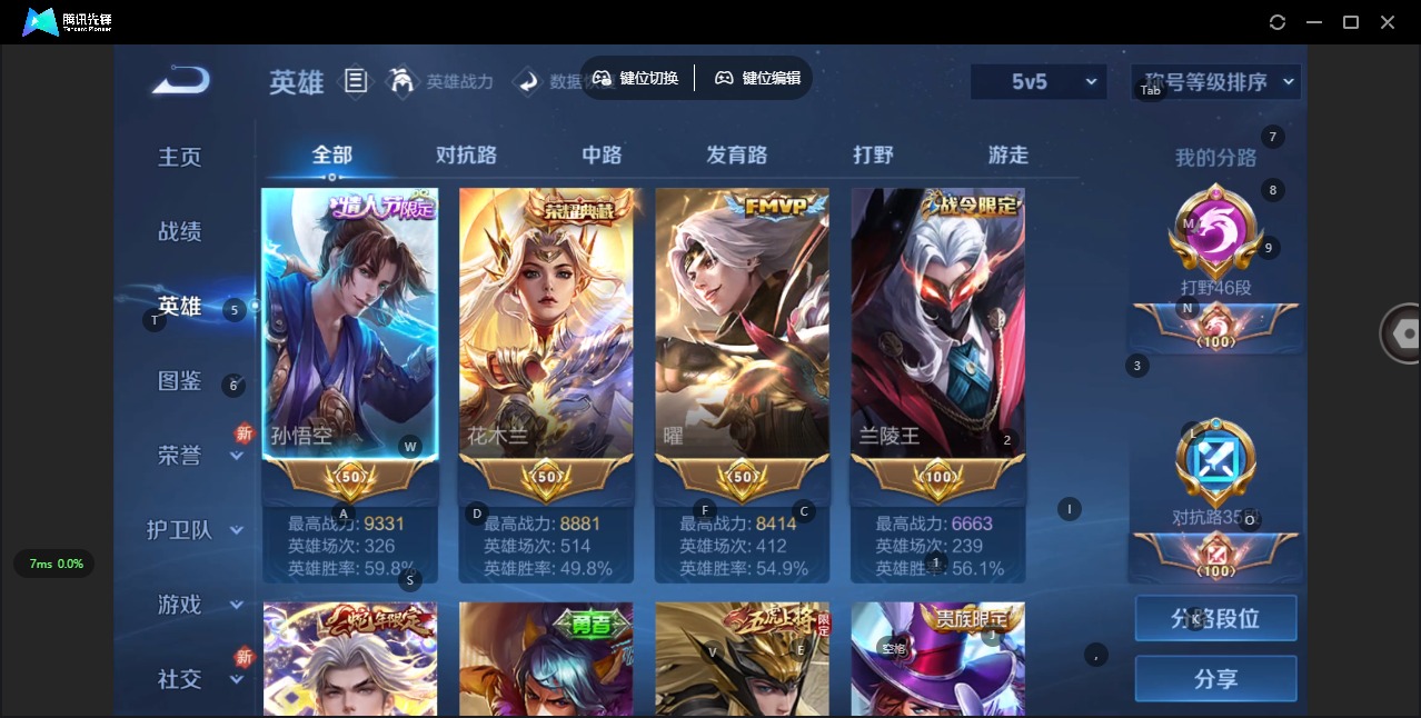 - PX_2057222-贵族等级: V7 英雄数: 124 皮肤数: 252 星传说: 零号·雷霆 传说皮: 黄金射手座,绛天战甲,久胜战神,炽阳神光,一念神魔,零号·赤焰,淬星耀世,超时空战士-狄仁杰,澜逐花归海,乘龙·铭钟鼎,乘龙·淬吴钩,牧神诗旅,云诺千山 限定皮: 遇见飞天,李小龙,梁祝,岱宗,神威,青龙志,高山流水,五谷丰年,山海·玄木吟,鸣野蒿