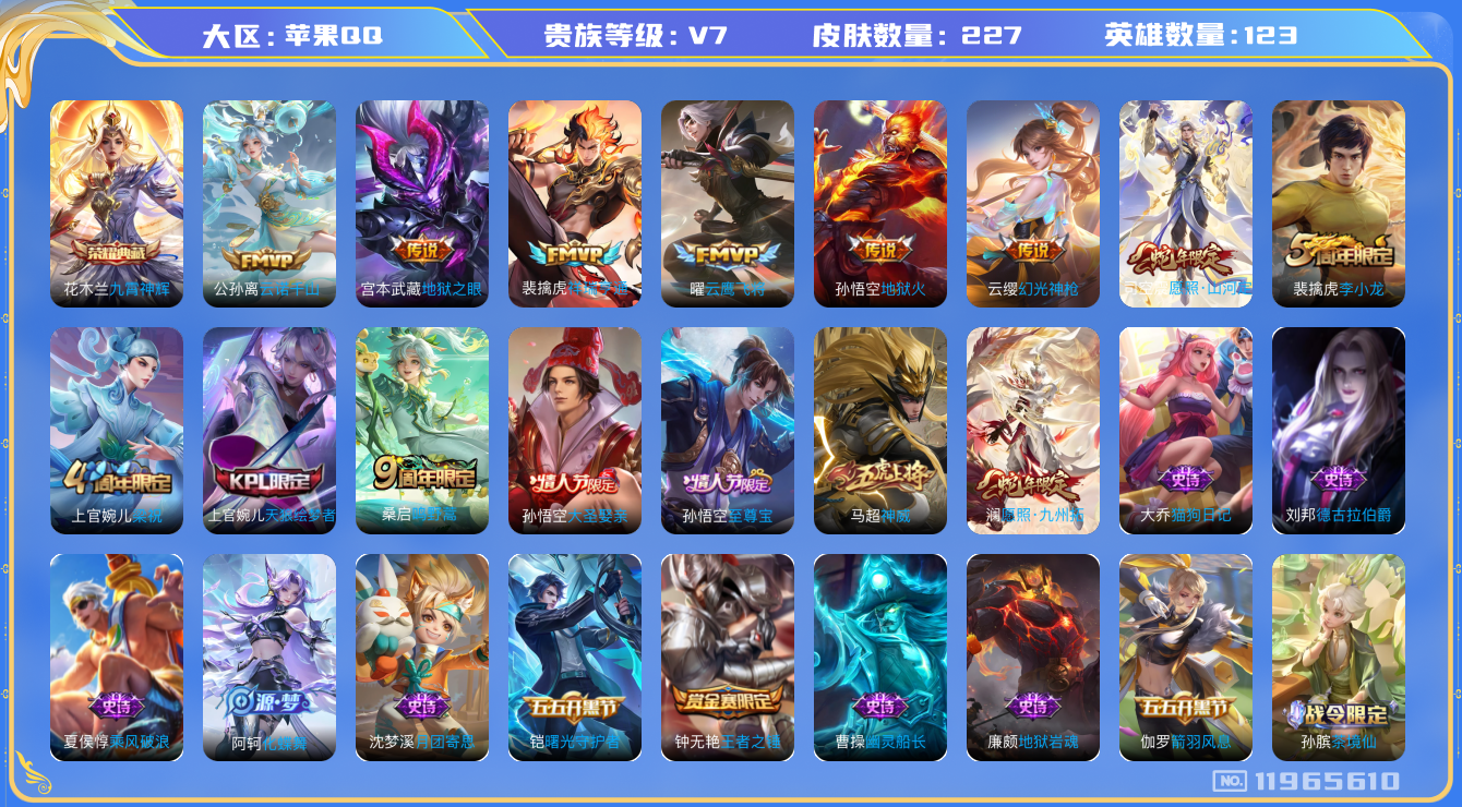 [11965610]V7 1典藏 9传说 123英雄 227皮肤 可修改实名 优质装备:九霄神辉(木兰典藏),云鹰飞将(小将军),地狱火,地狱之眼 传说皮:云诺千山,祥瑞亨通,幻光神枪 珍宝阁皮:优雅恋人,女武神 限定皮:愿照·九州拓(澜年限),愿照·山河定(司空震年限),鸣野蒿,至尊宝,神威(电光马子),梁祝,天狼绘梦者,李小龙,大圣娶亲 史诗皮:化蝶舞,星界战将,龙之律动,茶境仙,蔬乡物语(鲁班七号),紫霞仙子,白龙吟,黄金分割率,特工魅影,蒙恬荣光圣徽,冰冠公主,偶像歌手,末日机甲-吕布,猫狗日记-孙策,猫狗日记-大乔,修罗,摇滚巨星,水果甜心,天才门将,星夜王子,功夫厨神,德古拉伯爵,暗隐猎兽者,幽灵船长,心灵战警,舞动绿茵,地狱岩魂,纤云弄巧,繁星吟游(呼啦呼啦),拒霜思,乘风破浪,逐浪之夏,月团寄思,水晶猎龙者,曙光守护者,箭羽风息,金属风暴,原初追逐者,圣诞狂欢,圣诞恋歌,鹰眼统帅,王者之锤,魅力维加斯,黎明之约