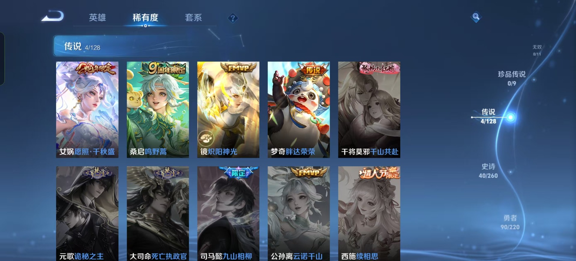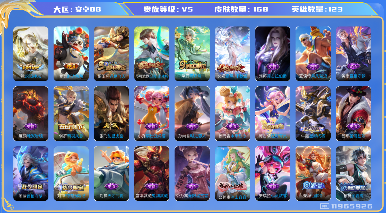 [11965926]V5 4传说 123英雄 168皮肤 可修改实名 优质装备:炽阳神光,胖达荣荣,涂山容容 珍宝阁皮:女武神 限定皮:愿照·千秋盛(女娲年限),鸣野蒿,遇见飞天,山海·玄木吟(马可年限) 史诗皮:鸭鸭历险记-刘禅,星界战将,百相守梦-周瑜,蒙犽顽岩魄,星界特工,百相守梦-黄忠,特工魅影,江河有灵,百解令(蒙犽),无限星赏官,偶像歌手,时之恋人-孙尚香,乱世虎臣,女仆咖啡,摇滚巨星,水果甜心,天才门将,星夜王子,心灵骇客,德古拉伯爵,鬼剑武藏,心灵战警,乐园奇幻夜,地狱岩魂,缤纷独角兽,乘风破浪,箭羽风息,金属风暴,原初追逐者,圣诞狂欢,鹰眼统帅,魅力维加斯