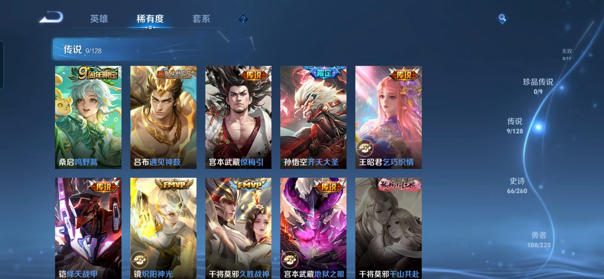 - PX_2023143-贵族等级: V10 英雄数: 124 皮肤数: 463 荣耀水晶: 武则天,倪克斯神谕,无限飓风号,活力突击,大秦宣太后,鸣剑·曳影,星域神启,九霄神辉,赤影疾锋,银白咏叹调,弑枪猎影,神鉴启示录 无双皮: 青丘·九尾,碎月剑心,韩信群星魔术团,花合斗 星传说: 幻海之心,未来机甲,幽冥之眼,零号·雷霆,金色仲夏夜,星际治安官,黛羽霜翎,乞巧织春,玉鸾吟 传说皮: 黄金狮子座