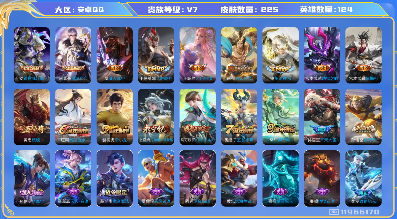 [11966170]V7 2典藏 9传说 124英雄 225皮肤 可修改实名 优质装备:星域神启(倪克斯贼亮),银白咏叹调(倪克斯侍卫),绛天战甲(鸡嘴战神),久胜战神,炽阳神光,地狱之眼,乞巧织情,惊梅引,遇见神鼓,涂山容容 珍宝阁皮:蔷薇恋人,玩趣恶龙 限定皮:鸣野蒿,至尊宝,高山流水,齐天大圣,五谷丰年,烈魂,李小龙,孙行者,神器·万象笔,山海·玄木吟(马可年限) 史诗皮:星界战将,茶境仙,怒海争锋,破空之剑,蒙犽顽岩魄,琥珀纪元伽罗,上官婉儿群星魔术团,蔬乡物语(鲁班七号),百相守梦-百里守约,紫霞仙子,黄金分割率,特工魅影,千年之狐,江河有灵,真我赫兹(镜),魅语,百解令(蒙犽),高渐离燃音魔法,蒙恬荣光圣徽,冰冠公主,偶像歌手,电玩·爆裂旋风,暗夜猫娘,末日机甲-吕布,女仆咖啡,水果甜心,功夫厨神,幽灵船长,鬼剑武藏,心灵战警,乐园奇幻夜,天秀·启明,地狱岩魂,纤云弄巧,拒霜思,乘风破浪,逐浪之夏,水晶猎龙者,金属风暴,原初追逐者,圣诞狂欢,圣诞恋歌,鹰眼统帅,黎明之约,天秀·音浪,无心,未来纪元-赵云