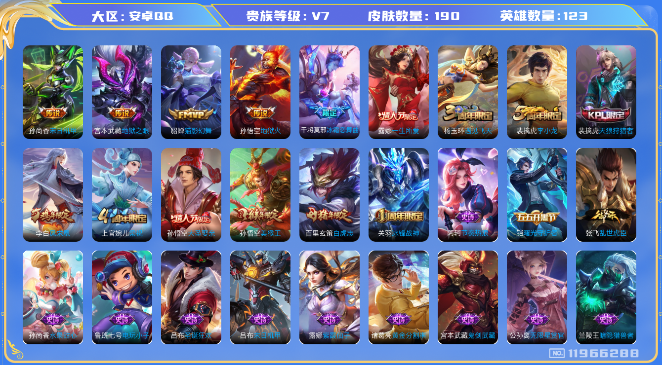 - PX_2089004- 可二次 V8 贵族积分78754 安卓QQ/322皮肤/123英雄/2典藏/0珍品无双/0无双/0珍品传说/17传说/93史诗/7稀有英雄 【3 星传说皮肤】,未来机甲 孙尚香,幽冥火 孙悟空,幽冥之眼 宫本武藏, 【2 典藏皮肤】,鸣剑·曳影 李白,全息碎影 孙悟空, 【17 传说皮肤】,启明星使 虞姬,云霓雀翎 虞姬,前尘镜 娜可露露,零号·赤焰 孙悟空,地狱火 孙悟空
