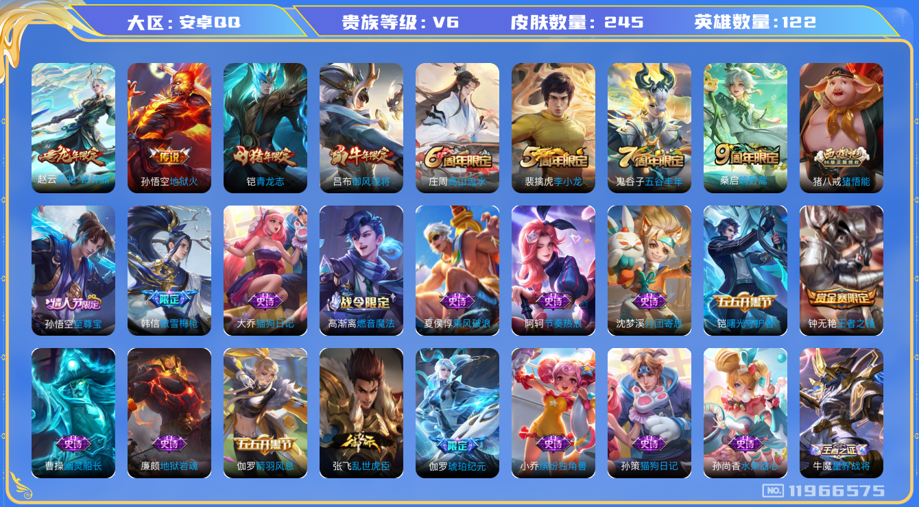 [11966575]V6 3传说 122英雄 245皮肤 可修改实名 优质装备:地狱火 传说皮:乘龙·铭钟鼎(赵云年限) 珍宝阁皮:妄想食味,蔷薇恋人,玩趣恶龙 限定皮:鸣野蒿,至尊宝,傲雪梅枪,高山流水,五谷丰年,青龙志(铠年限),御风骁将(吕布年限),李小龙,猪悟能 史诗皮:星界战将,琥珀纪元伽罗,蔬乡物语(鲁班七号),紫霞仙子,黄金分割率,特工魅影,千年之狐,雪夜绮愿(周瑜),百解令(蒙犽),高渐离燃音魔法,冰冠公主,末日机甲-吕布,猫狗日记-孙策,猫狗日记-大乔,乱世虎臣,节奏热浪,修罗,女仆咖啡,摇滚巨星,水果甜心,星夜王子,心灵骇客,功夫厨神,暗隐猎兽者,幽灵船长,鬼剑武藏,心灵战警,舞动绿茵,地狱岩魂,纤云弄巧,繁星吟游(呼啦呼啦),拒霜思,缤纷独角兽,乘风破浪,逐浪之夏,月团寄思,水晶猎龙者,曙光守护者,箭羽风息,金属风暴,圣诞恋歌,鹰眼统帅,王者之锤,暗夜贵公子,无心,未来纪元-赵云