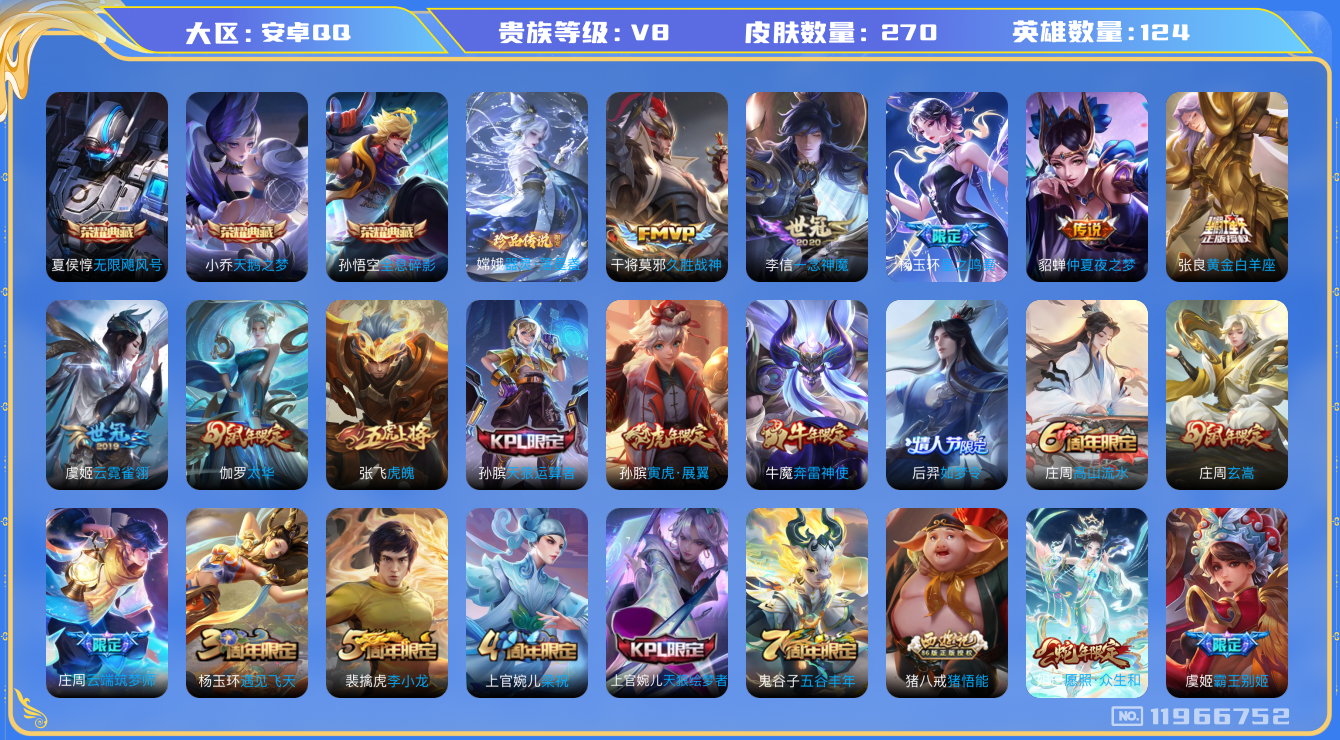 [11966752]V8 3典藏 1珍品传说 9传说 124英雄 270皮肤 典藏英雄武则天 可修改实名 优质装备:天鹅之梦(小乔典藏),无限飓风号(高达),全息碎影(猴子典藏),器灵·落星盏,黄金白羊座,久胜战神,一念神魔,云霓雀翎,仲夏夜之梦(大飞蛾) 传说皮:星之鸣奏 珍宝阁皮:优雅恋人,蔷薇恋人 限定皮:愿照·众生和(妲己年限),太华(伽罗年限),寅虎·展翼(孙膑年限),玄嵩(庄周年限),遇见飞天,高山流水,五谷丰年,天狼运算者,梁祝,虎魄,奔雷神使(牛魔年限),天狼绘梦者,李小龙,如梦令-嫦娥,如梦令-后羿,霸王别姬-虞姬,猪悟能,云端筑梦师 史诗皮:器灵·浮梦炉,化蝶舞,茶境仙,遇见神鹿,紫霞仙子,黄金分割率,魅语,百解令(蒙犽),冰冠公主,偶像歌手,白蛇,晚萤,猫狗日记-孙策,猫狗日记-大乔,时之恋人-孙尚香,乱世虎臣,节奏热浪,女仆咖啡,摇滚巨星,绅士熊喵,天才门将,星夜王子,心灵骇客,功夫厨神,德古拉伯爵,暗隐猎兽者,鬼剑武藏,心灵战警,舞动绿茵,地狱岩魂,纤云弄巧,繁星吟游(呼啦呼啦),拒霜思,缤纷独角兽,逐浪之夏,曙光守护者,箭羽风息,金属风暴,原初追逐者,圣诞狂欢,圣诞恋歌,鹰眼统帅,魅力维加斯,赏金猎手,未来纪元-赵云