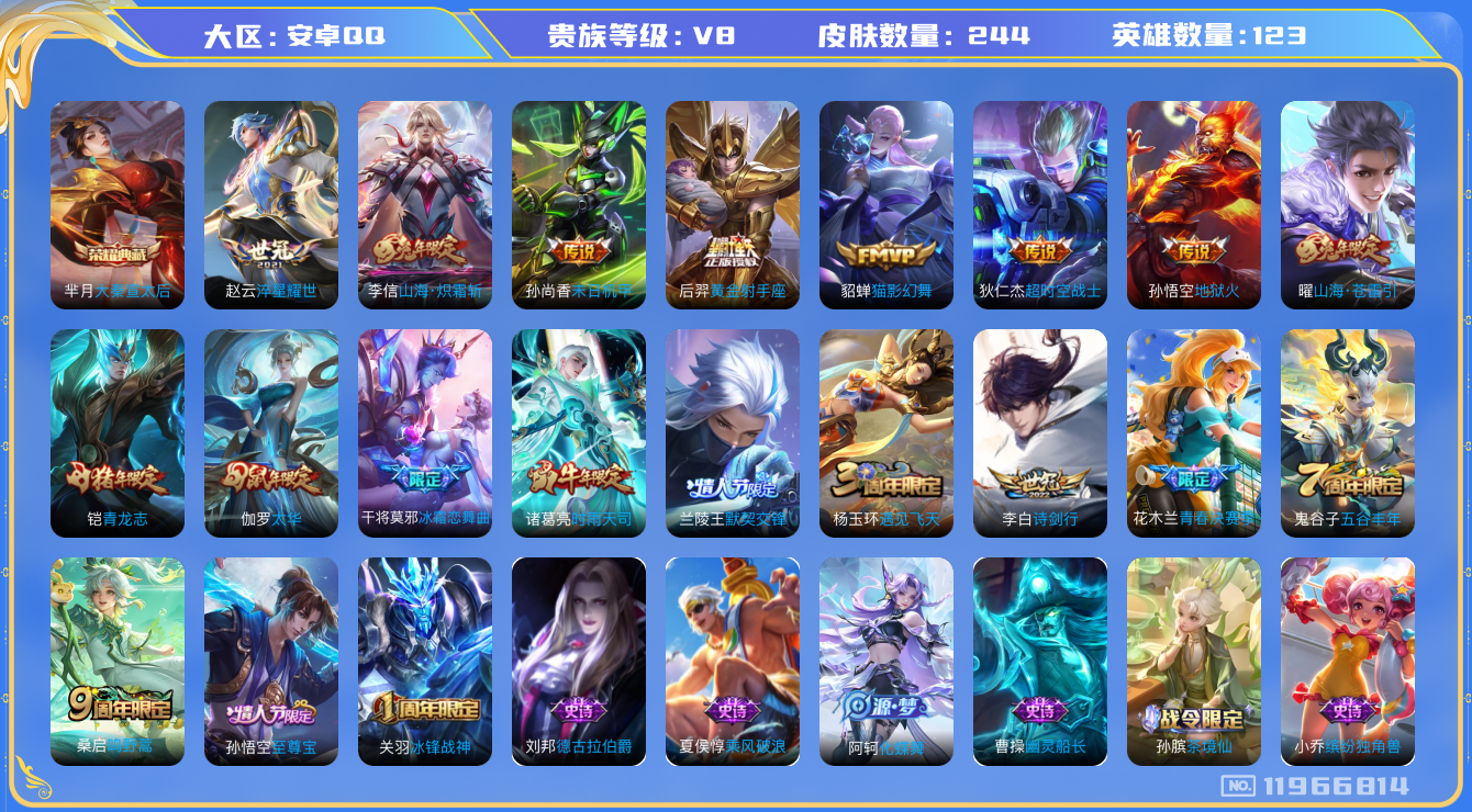 [11966814]V8 1典藏 14传说 123英雄 244皮肤 可修改实名 优质装备:大秦宣太后,黄金射手座,猫影幻舞,末日机甲-孙尚香(绿蚂蚱),地狱火,淬星耀世,超时空战士-狄仁杰,山海·炽霜斩(李信年限),山海·苍雷引(电光曜子) 珍宝阁皮:蔷薇恋人 限定皮:鸣野蒿,至尊宝,太华(伽罗年限),时雨天司(水龙头),遇见飞天,诗剑行,五谷丰年,青龙志(铠年限),冰锋战神,默契交锋-兰陵王,青春决赛季,冰霜恋舞曲 史诗皮:化蝶舞,龙之律动,茶境仙,遇见神鹿,紫霞仙子,白龙吟,千年之狐,浮梦罗烟,冰冠公主,偶像歌手,晚萤,电玩·爆裂旋风,末日机甲-吕布,猫狗日记-孙策,女仆咖啡,摇滚巨星,水果甜心,星夜王子,心灵骇客,功夫厨神,德古拉伯爵,暗隐猎兽者,幽灵船长,鬼剑武藏,心灵战警,天秀·启明,舞动绿茵,缤纷独角兽,乘风破浪,逐浪之夏,金属风暴,圣诞狂欢,圣诞恋歌,鹰眼统帅,黎明之约,未来纪元-赵云