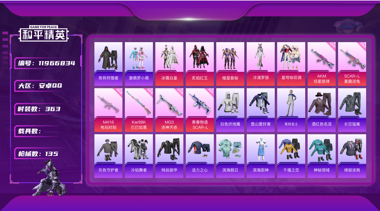 - PX_2056736- 安卓手Q-4王牌印记-10粉装-9特效枪-2载具-77160热力值-152套装-194枪皮-1卓越印记-1传奇印记 【10粉装】,放客神游,新星烈龙,古堡领主,金属狂野,智能音符,彗云及圣,天启纪元,星空之魅,萨利娅,金风玉露 【9特效枪】AKM-炫紫旋律-5级 M416-心之恋语-7级 M416-墨龙九天-1级 GROZA-镜光银凌-5级 AUG-暖羊咩咩-5级 Kar9